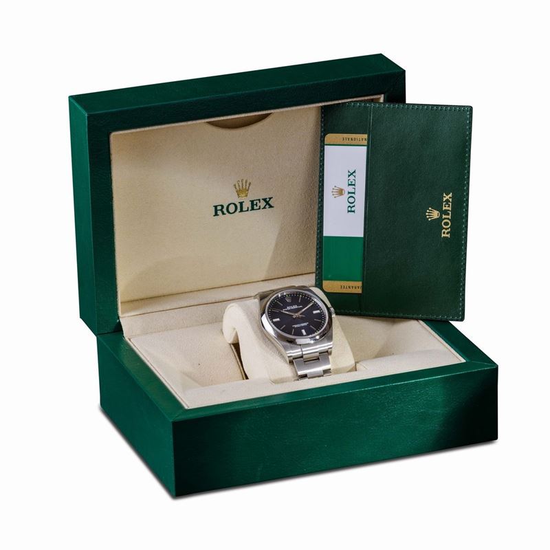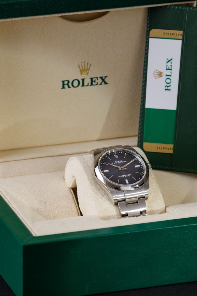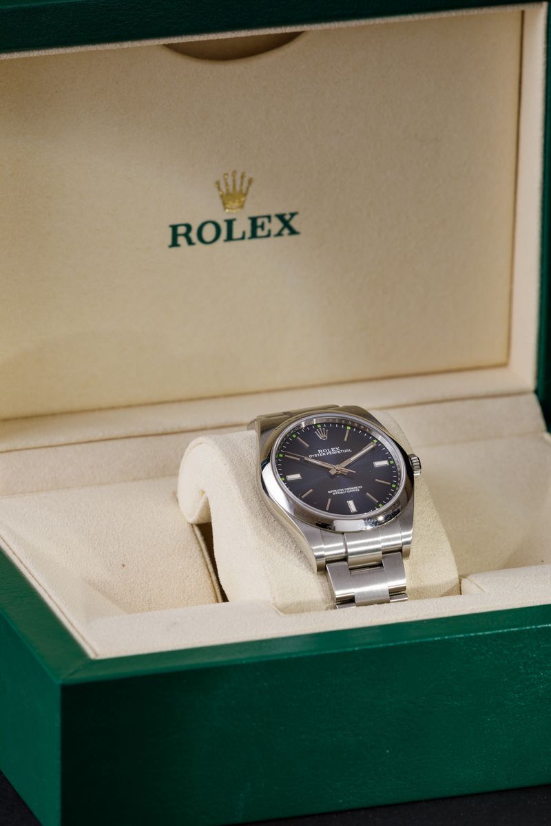 ROLEX - Oyster Perpetual ref 114300, Oyster acciaio, quadrante blu radiale con piccoli indici verdi, 2019. Scatola e gara [..]