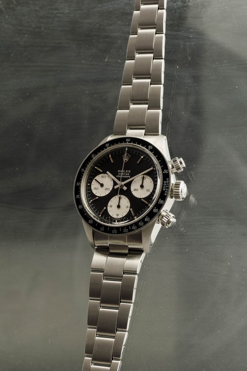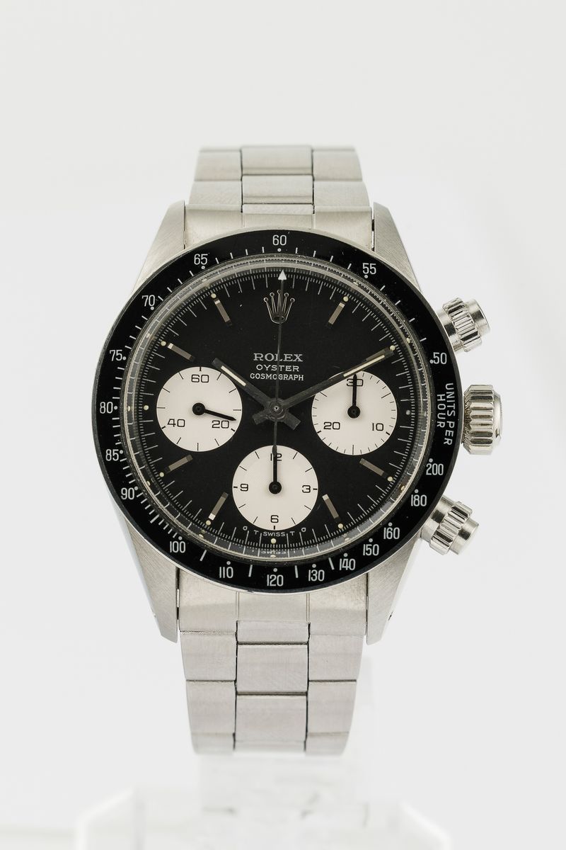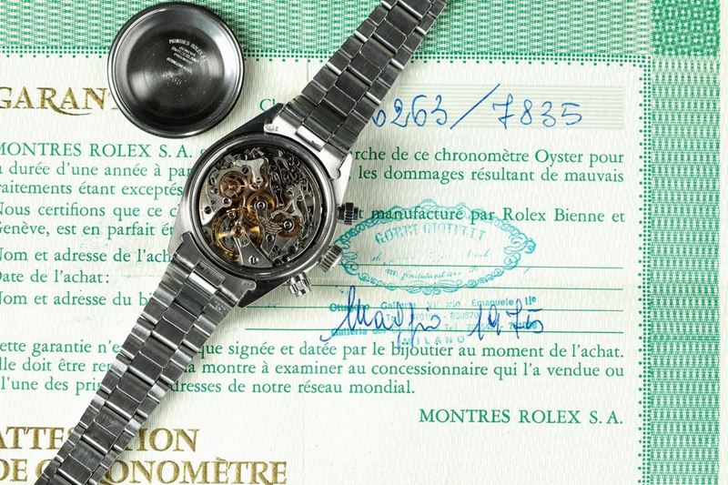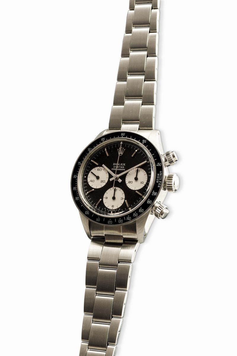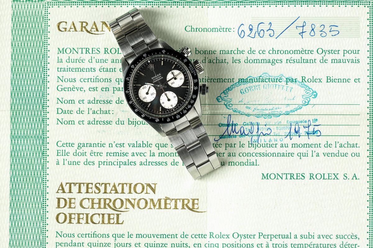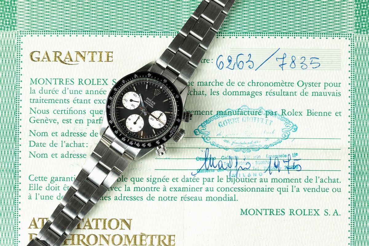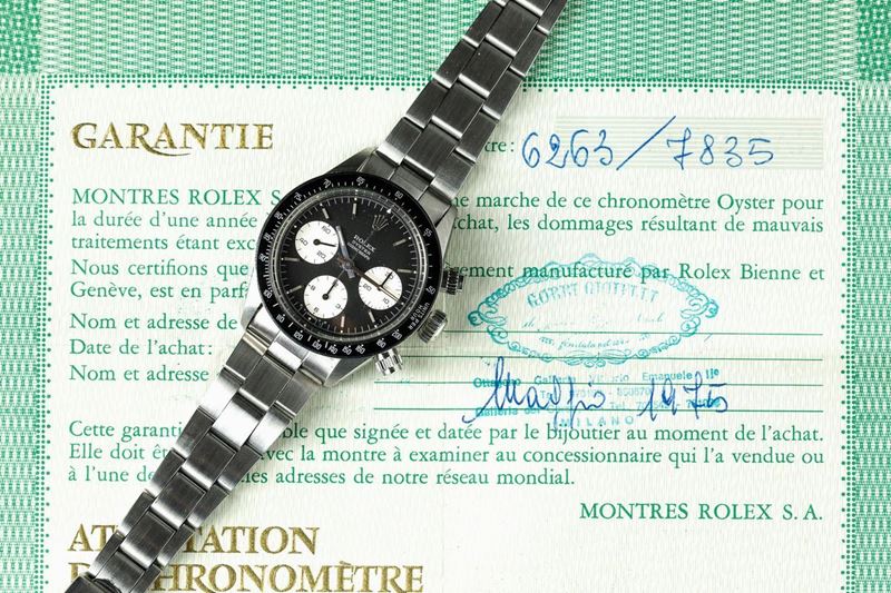 La referenza 6263, contemporaneamente alla referenza 6265, è stata in produzione dalla fine degli anni ’60 fino al 1987. Per molti collezionisti questa configurazione, con inserto della ghiera nero e tasti a vite, è la più iconica della serie Daytona. La rarità di questo orologio è arricchita dalla presenza di un quadrante “Sigma” che segnala la presenza di indici d’oro bianco. L’orologio conservato in condizioni di “fondo di magazzino”, non è mai apparso prima in asta in quanto è stato custodito dal primo proprietario dal 1975 e indossato in rarissime occasioni. Ad accompagnare l’orologio ci sono scatola originale e garanzia, dettaglio estremamente raro per orologi di quest’epoca. - - - Reference 6263, was in production from the late 1960s until 1987. For many collectors this configuration, with black bezel insert and screw-down buttons, is the most iconic of the Daytona series. The rarity of this watch is enhanced by the presence of a “Sigma” dial denoting the markers are in white gold. The watch, preserved in new old stock condition, has never appeared before at auction as it has been kept by the first owner since 1975 and worn on very rare occasions. The watch is accompanied by the original box and warranty, an extremely rare detail for watches of this era.