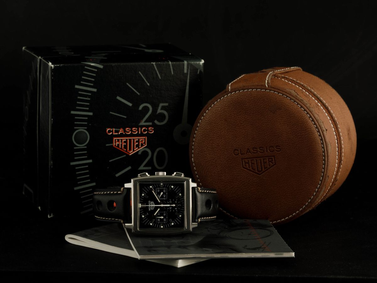 TAG HEUER - Monaco CS2111, cronografo automatico in acciaio, tasti quadri e cinturino in pelle rally. Accompagnato da scatola [..]