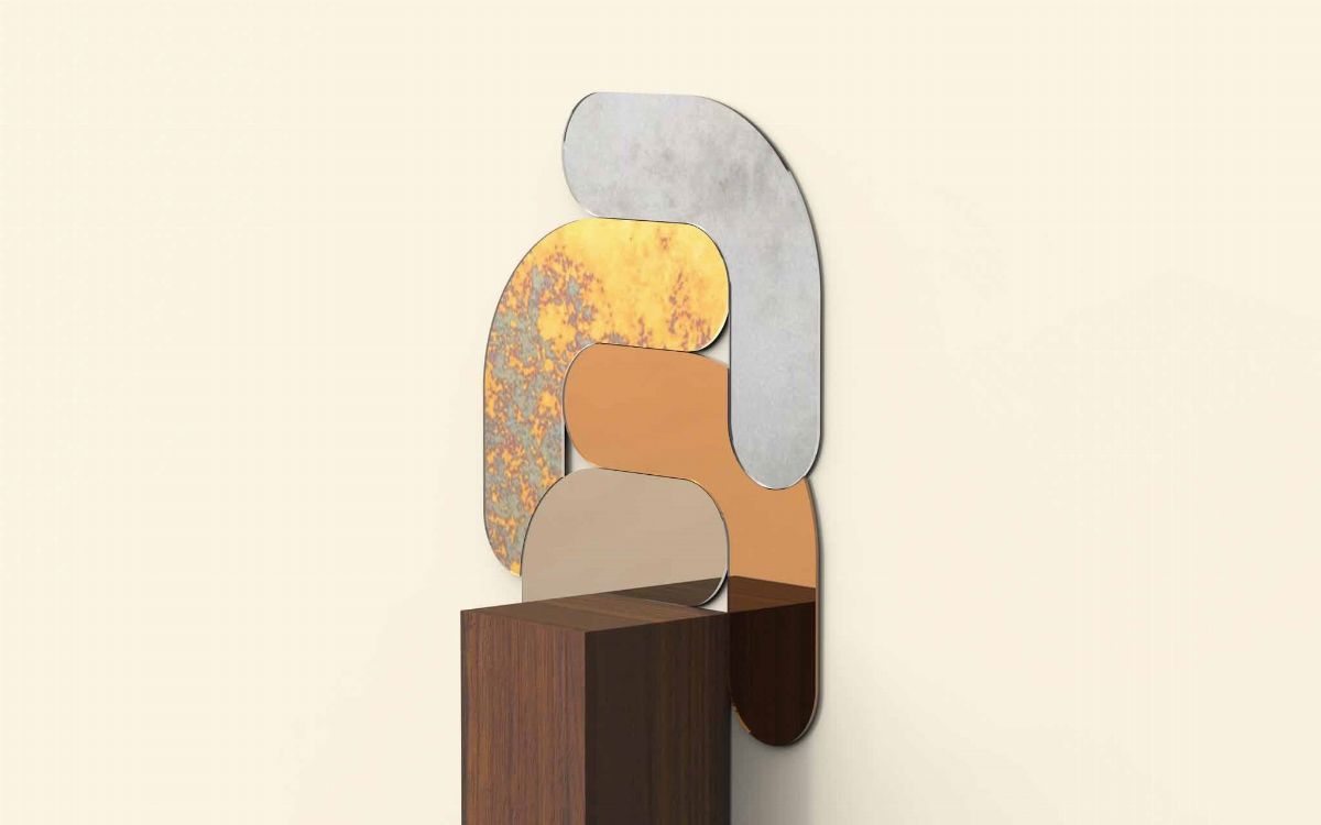 Mellow Mirrors expand on the theme of perception vs real- ity found in Bower's work. The forms of the glass mirrors and the way they interact with their wooden counterparts makes them look soft; lazily sagging and melting around rigid objects and each other.