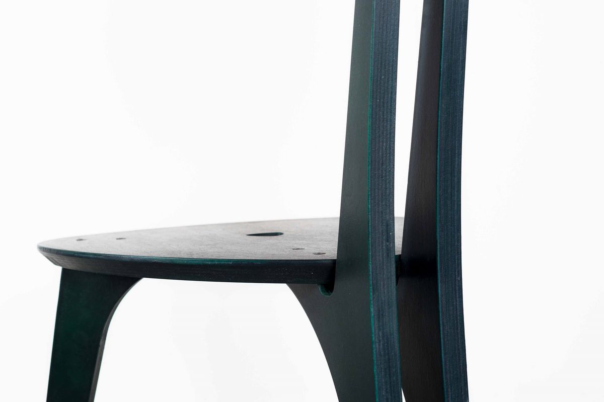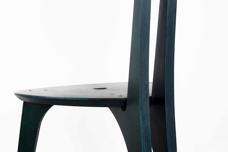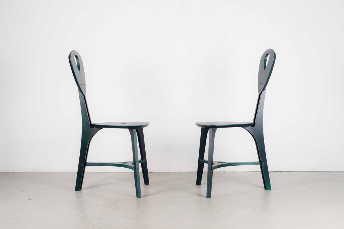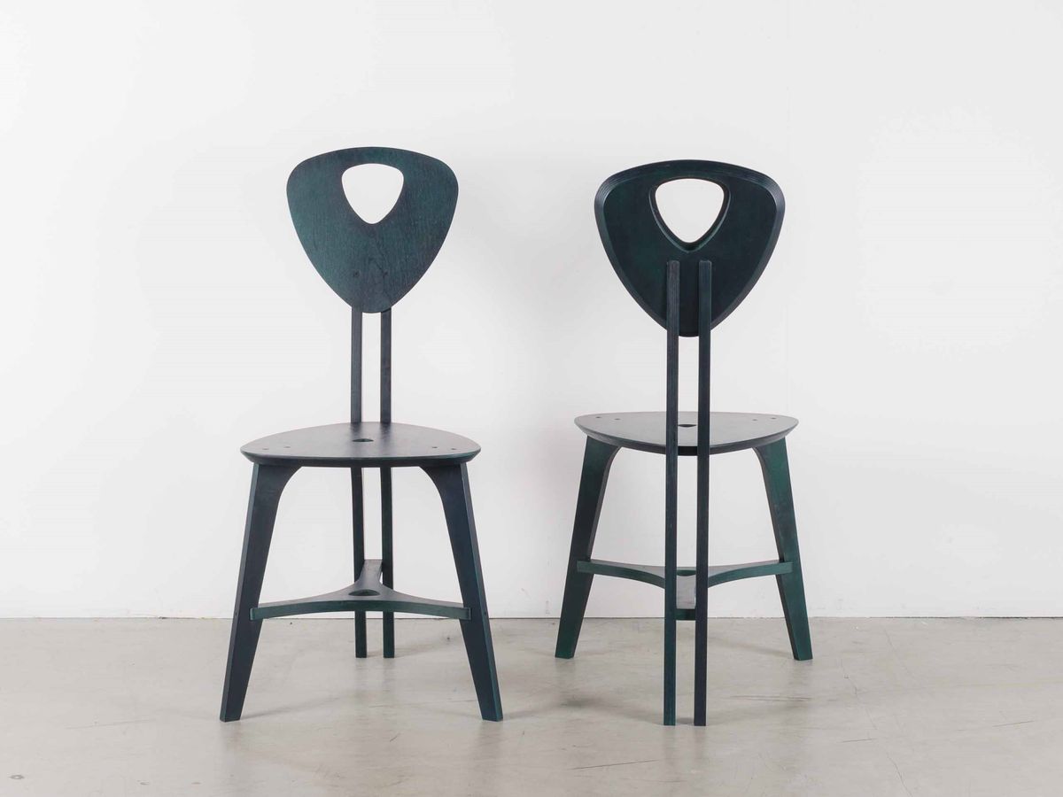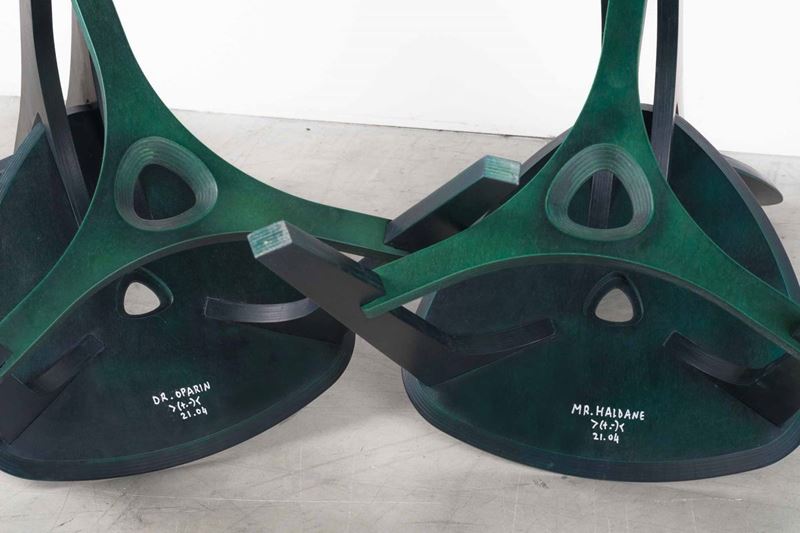 “Dr Oparin and Mr Haldane" is a piece unique com- posed of two specially coated Ops! chairs. The Ops! series (chairs and tables) are minimal furnitures made of different kinds of wood with different kinds of coat- ing designed in 2019, and developed during the pan- demics as limited series and unique pieces.