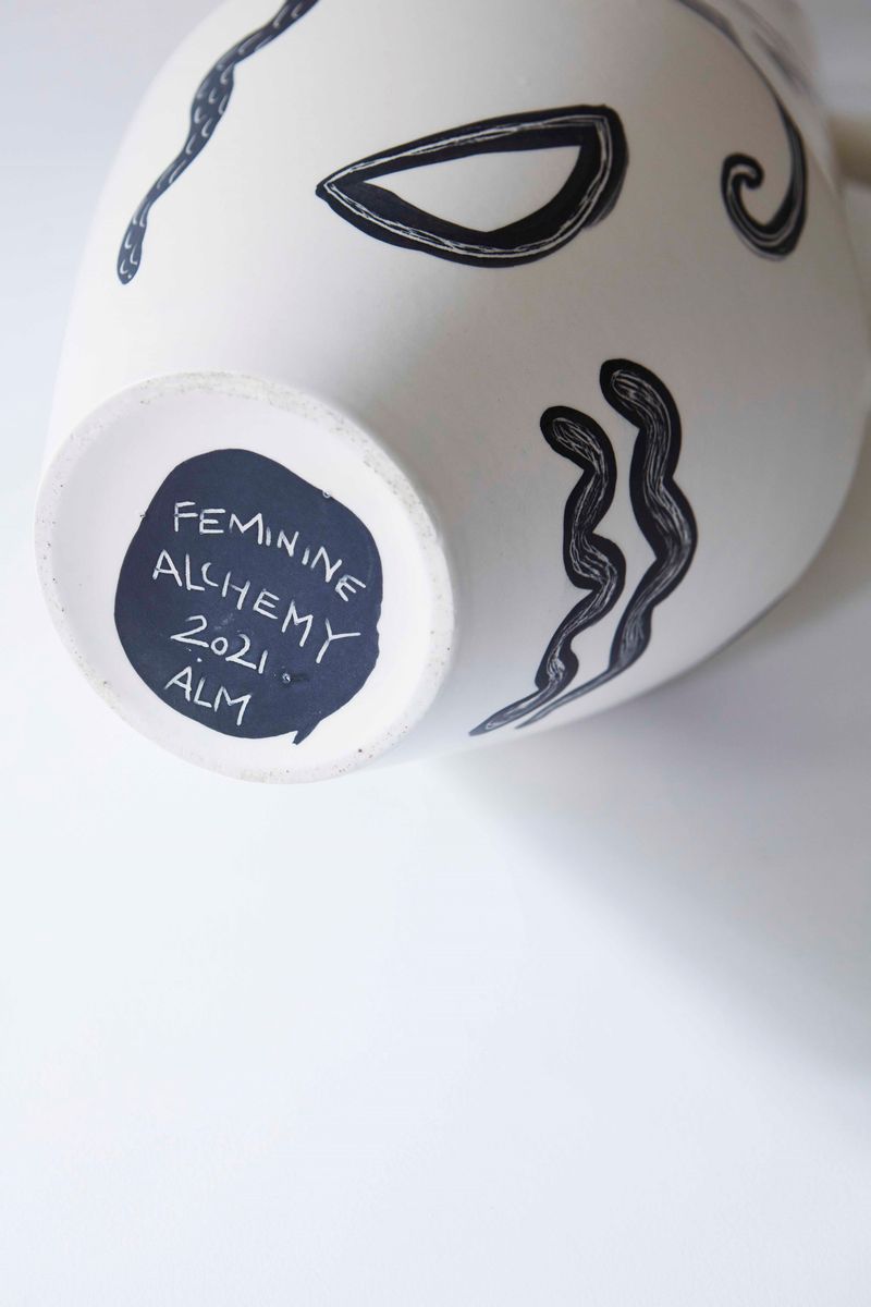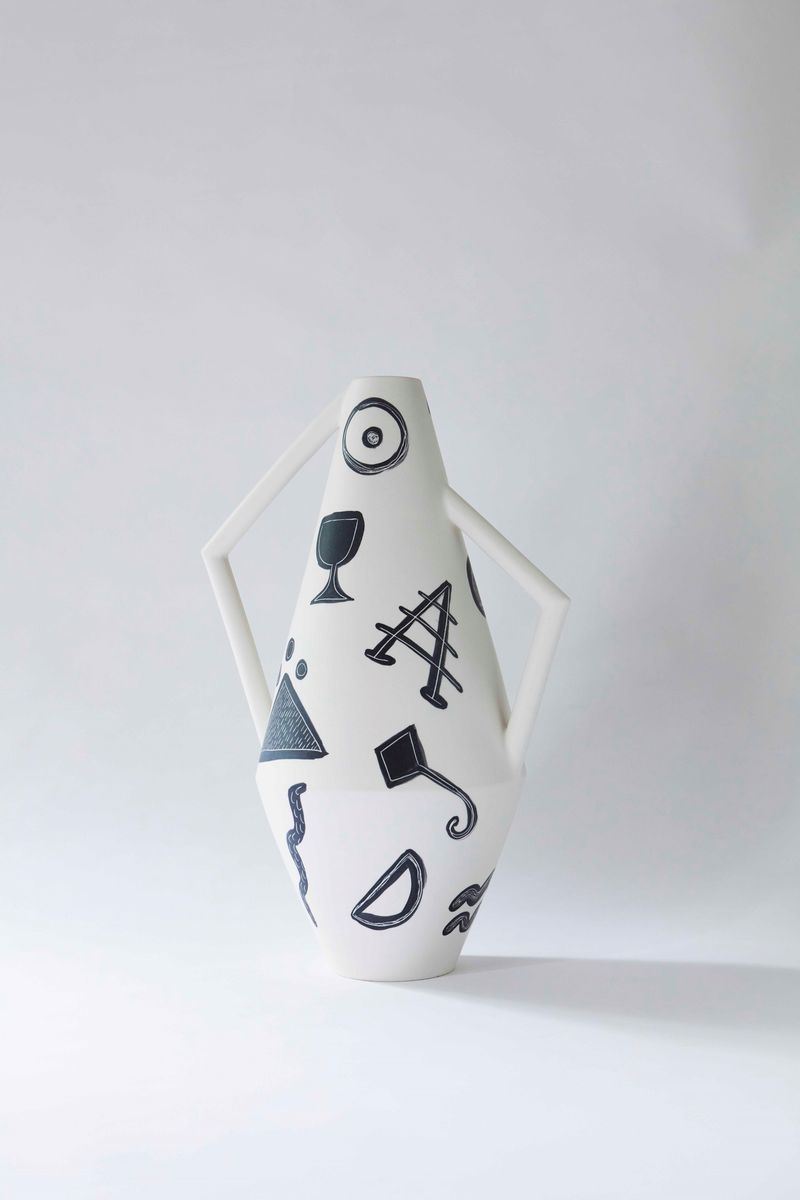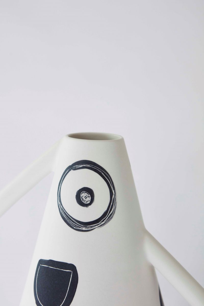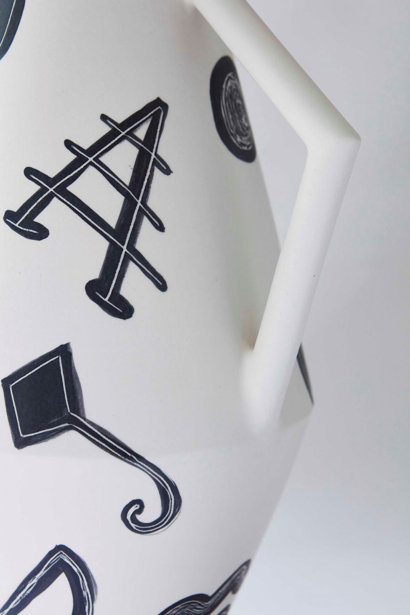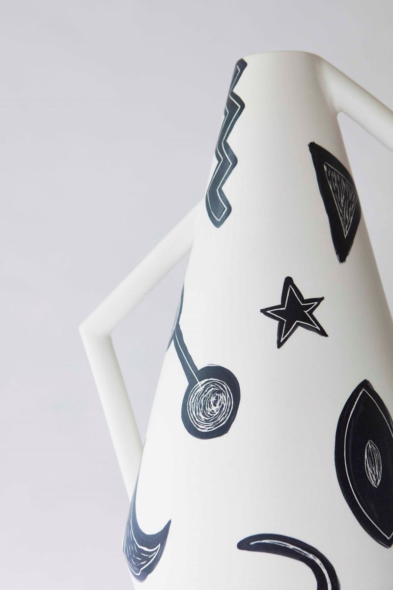 The Kora vase was inspired by the Greek korae, which are the statues rapresenting maidens in the act of sustain the tympanum of the Erechtheion temple in Athens. These vases have asymmetric handles and accentuated angles that remind the peaceful and harmonious pose of the ancient Greek statues. Limited edition of 2 in matte ceramic, hand-painted by Arianna Lelli Mami.