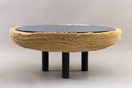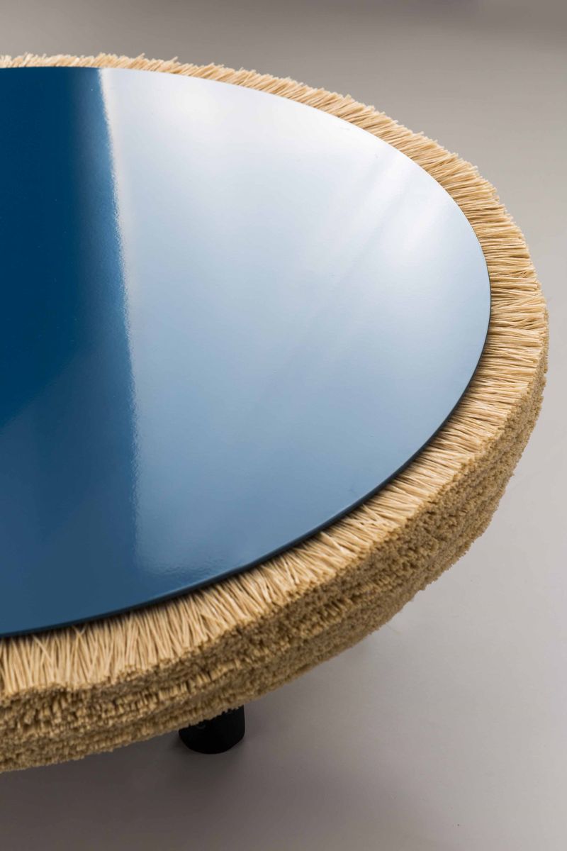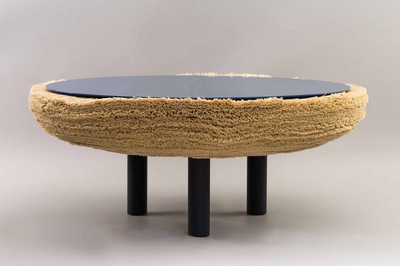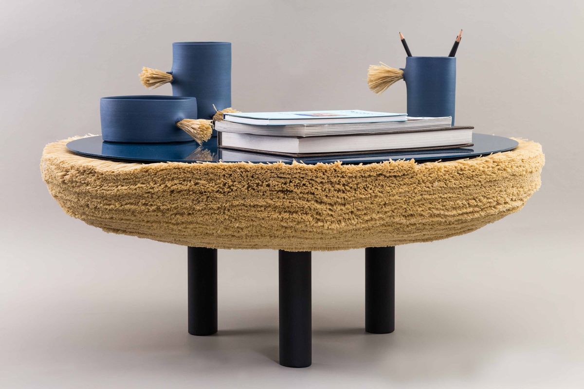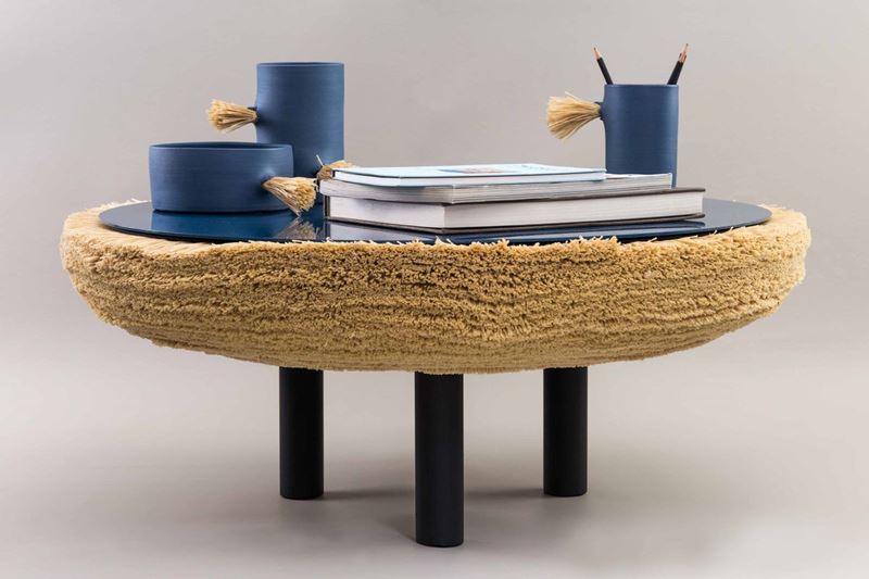 NINHO uses as the main material discarded carpet edges; overlapping layers result in volumes that seem to grow around the object containing its perimeter. Mohaded takes a discarded part of a massive production industry to an object of contemplation that becomes a provocation to the senses achieved from the unconventional use of a