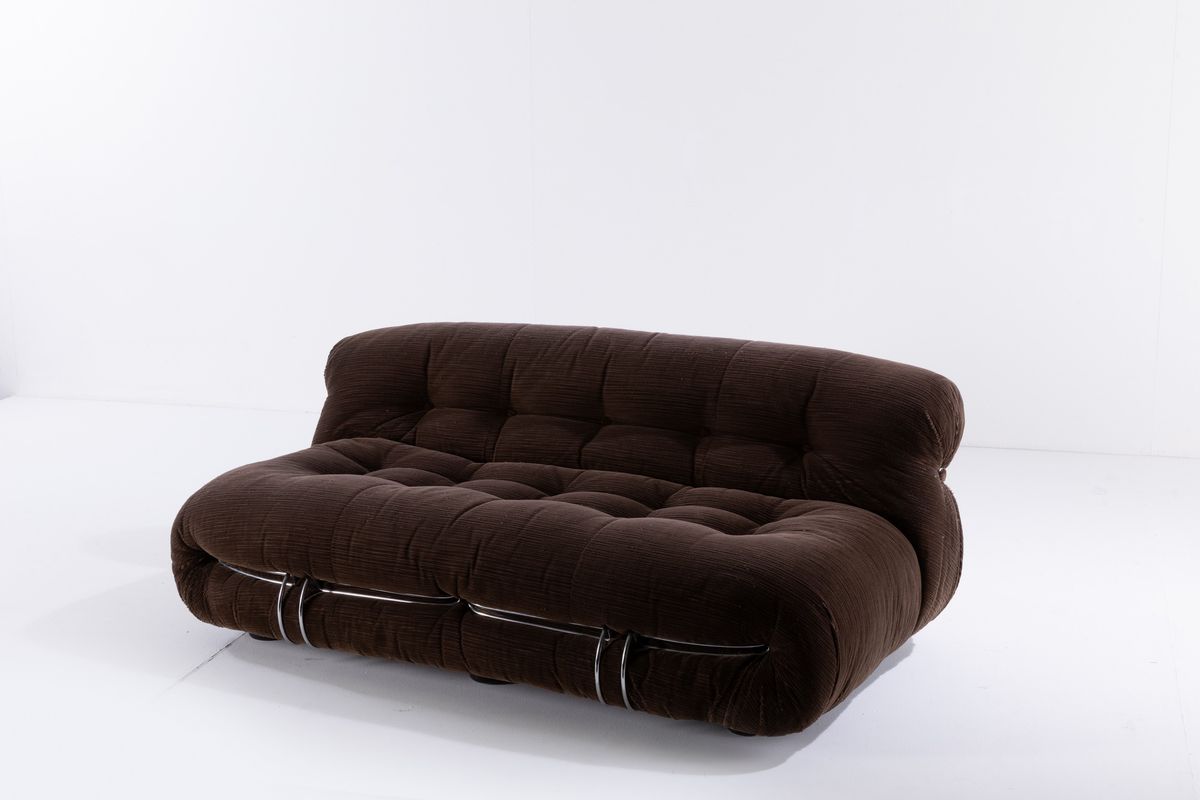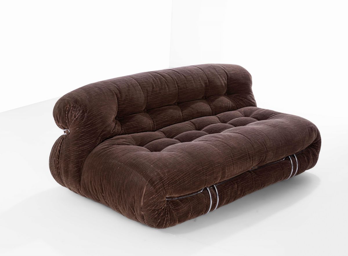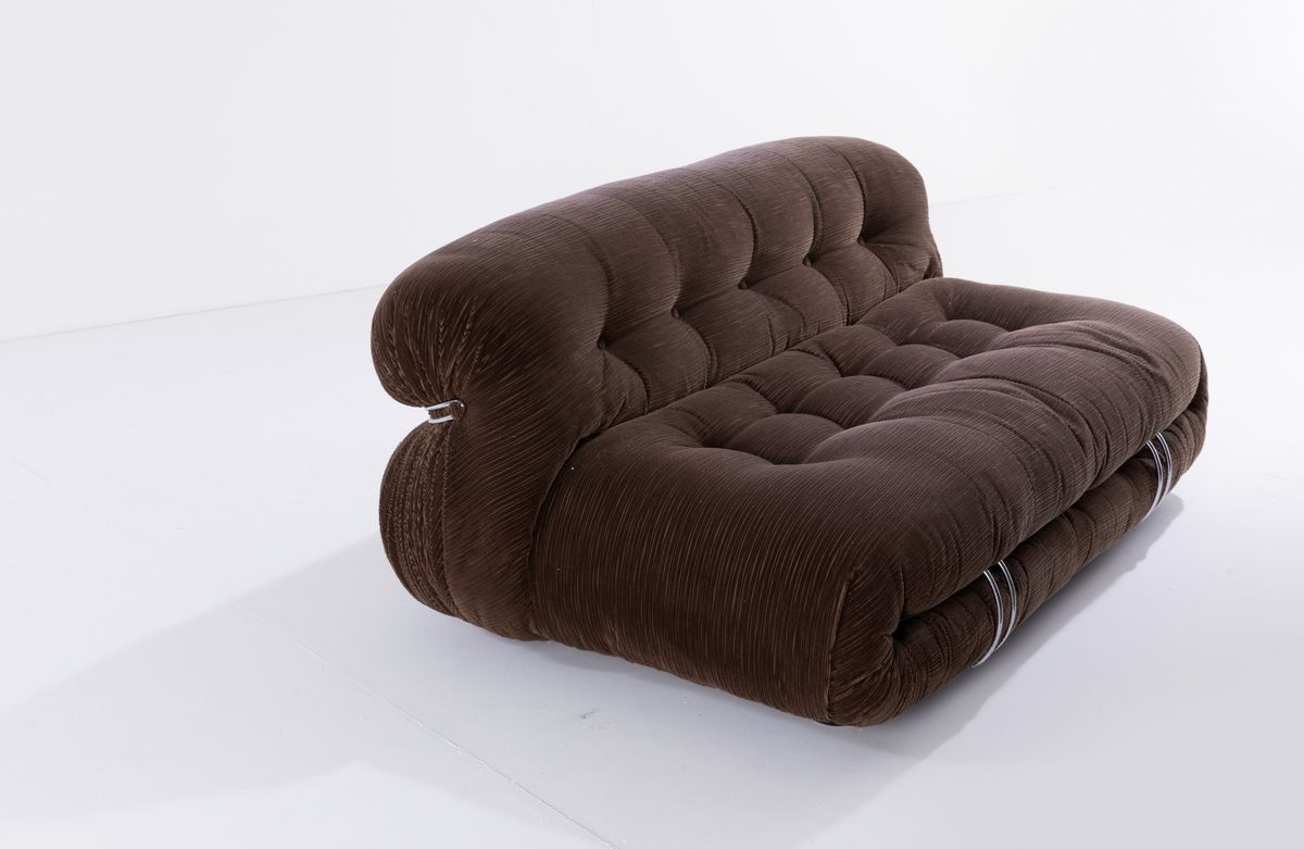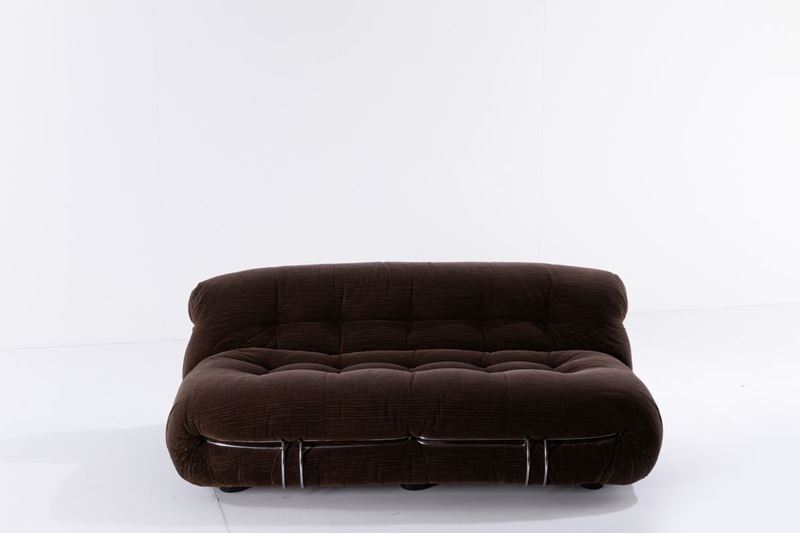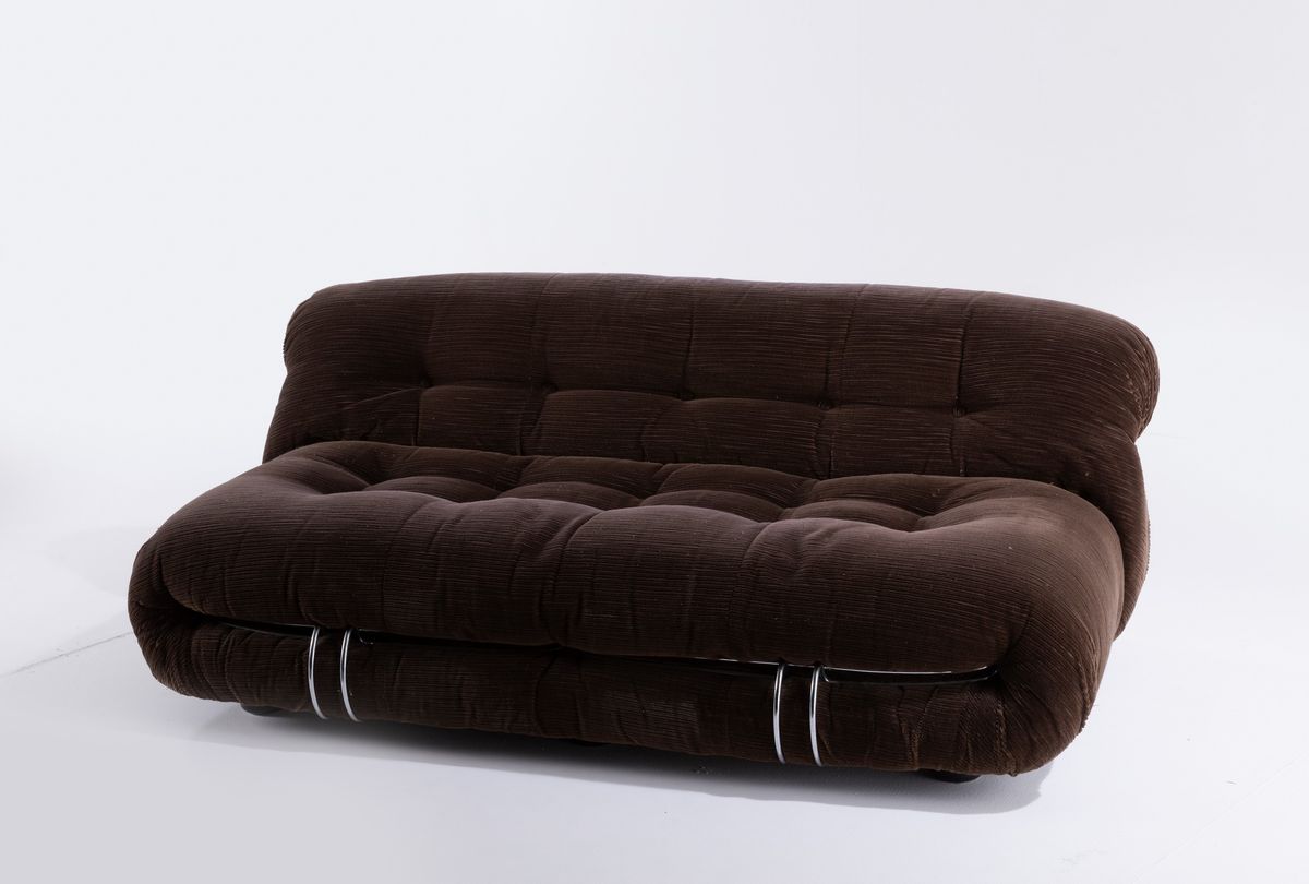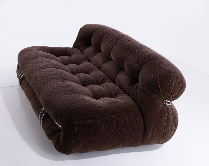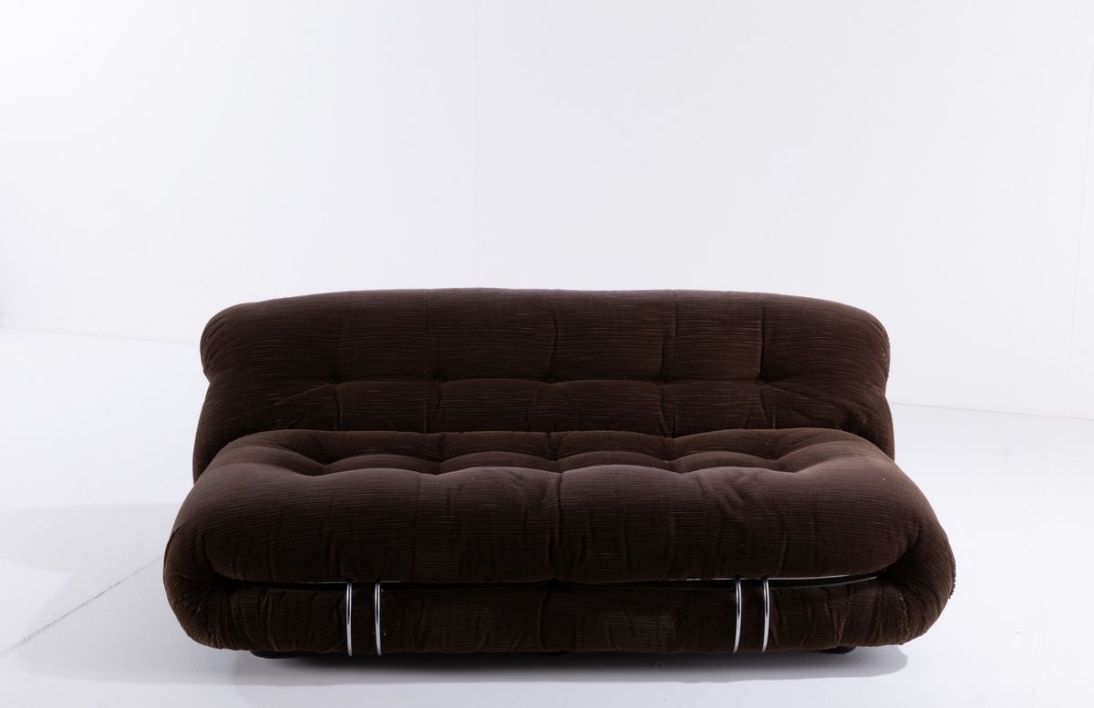 Coppia di divani mod. Soriana struttura in tubolare cromato e rivestimenti in tessuto. Disegno originale vincitore del Compasso D'oro nel 1969.