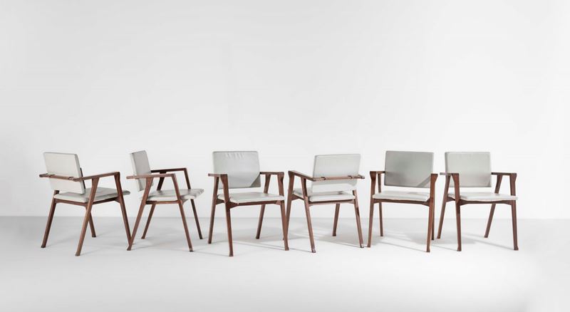 Sei sedie mod. Luisa, struttura e braccioli in legno, rivestimento in pelle.
