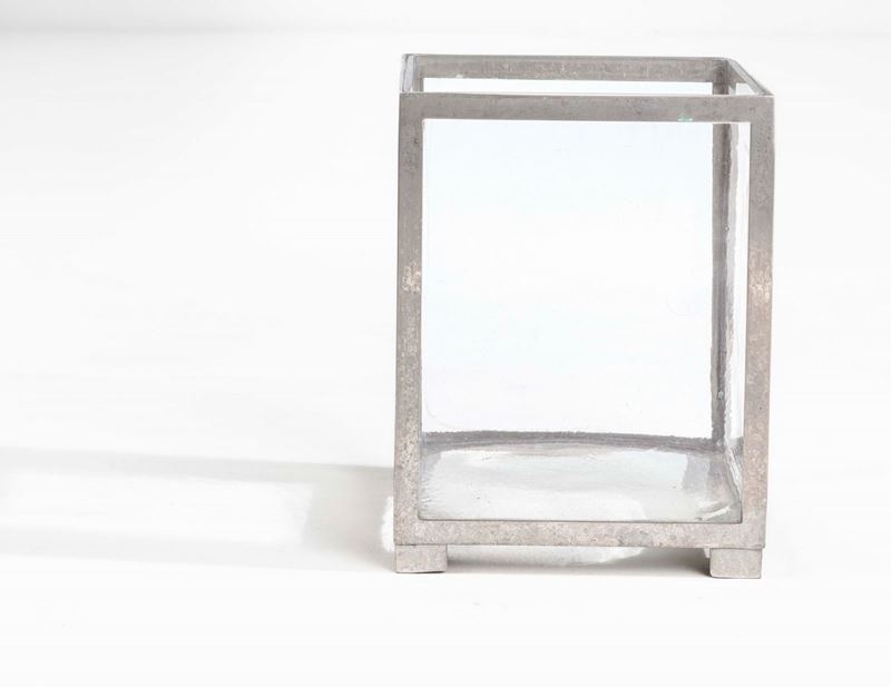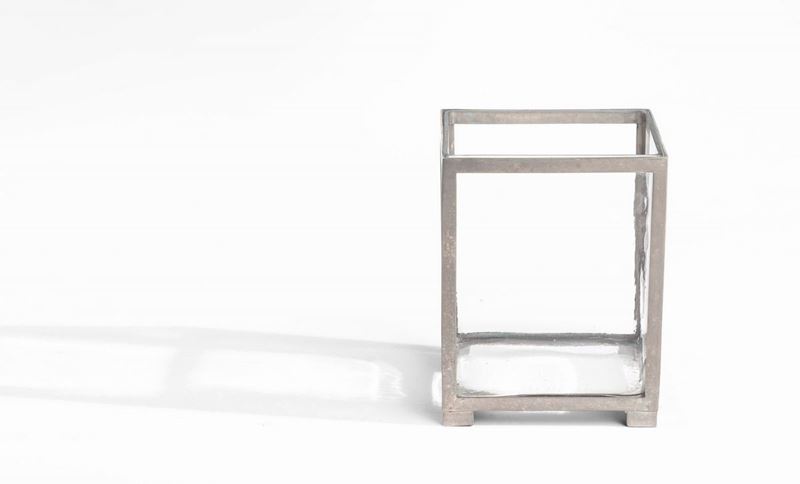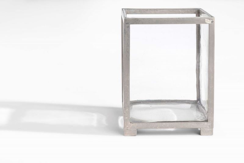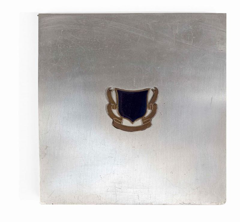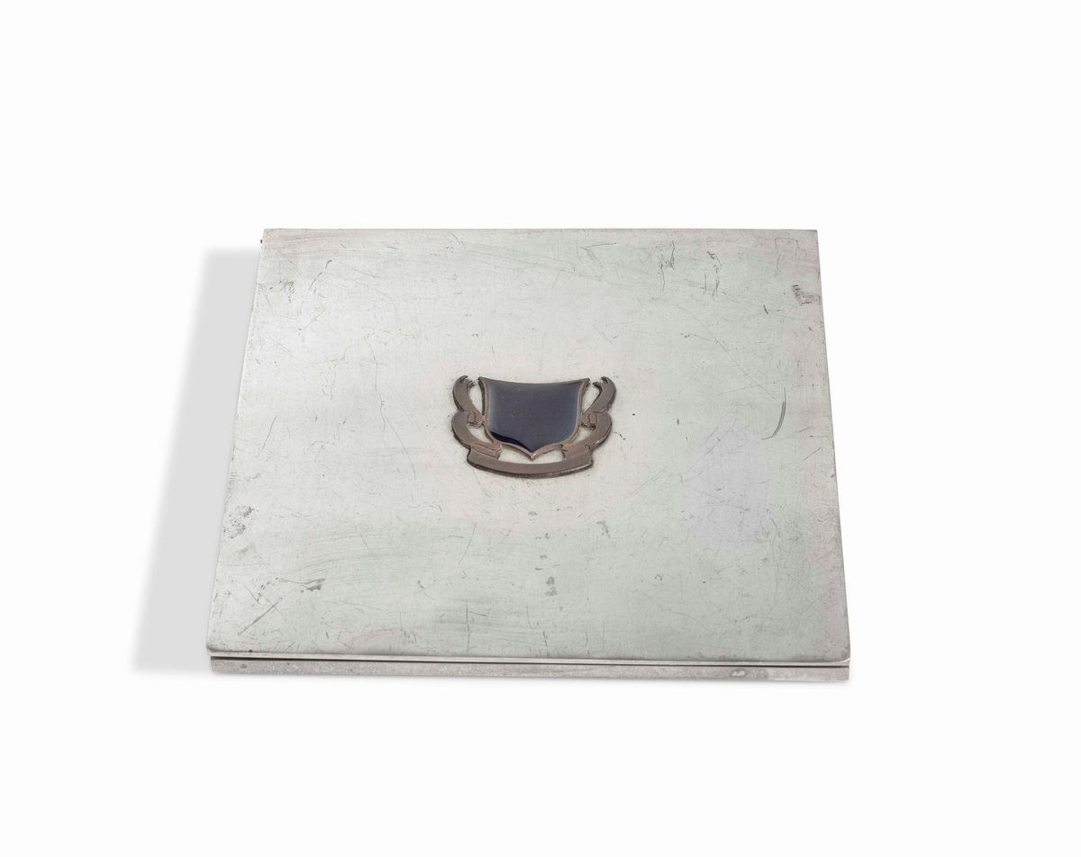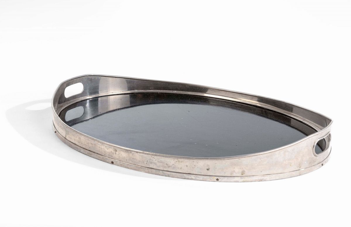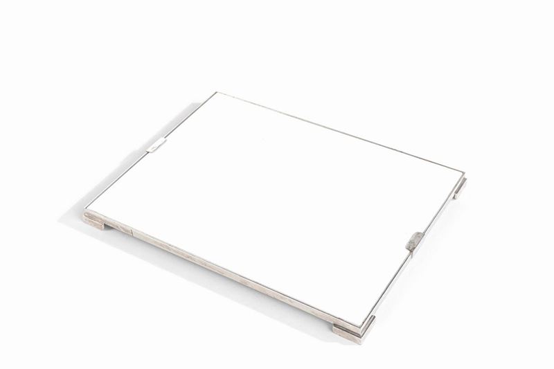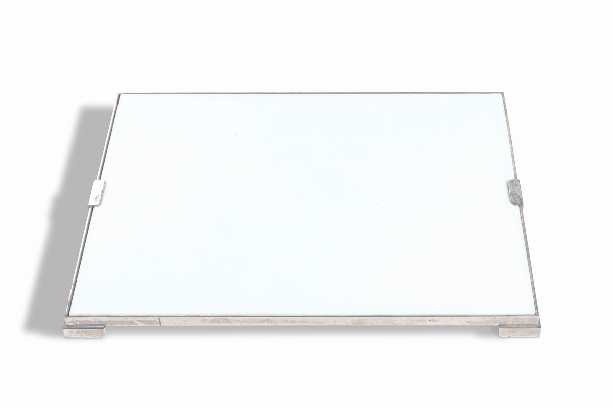 Set di oggetti da scrivania comprensivo di un vassoio in metallo laccato nero, un vassoio in metallo laccato bianco, un vaso, una scatola, un tagliacarte e una coppetta portaoggetti.