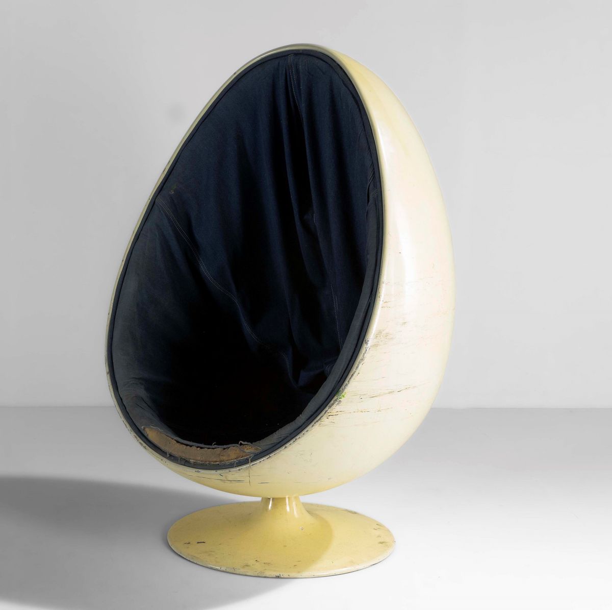 Poltrona mod. Ovalia con scocca in fibra di vetro e rivestimenti in tessuto.