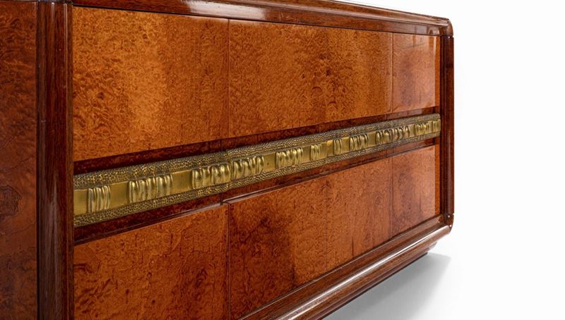 struttura in legno e rivestimenti in radica. Scultura in fusione di bronzo.