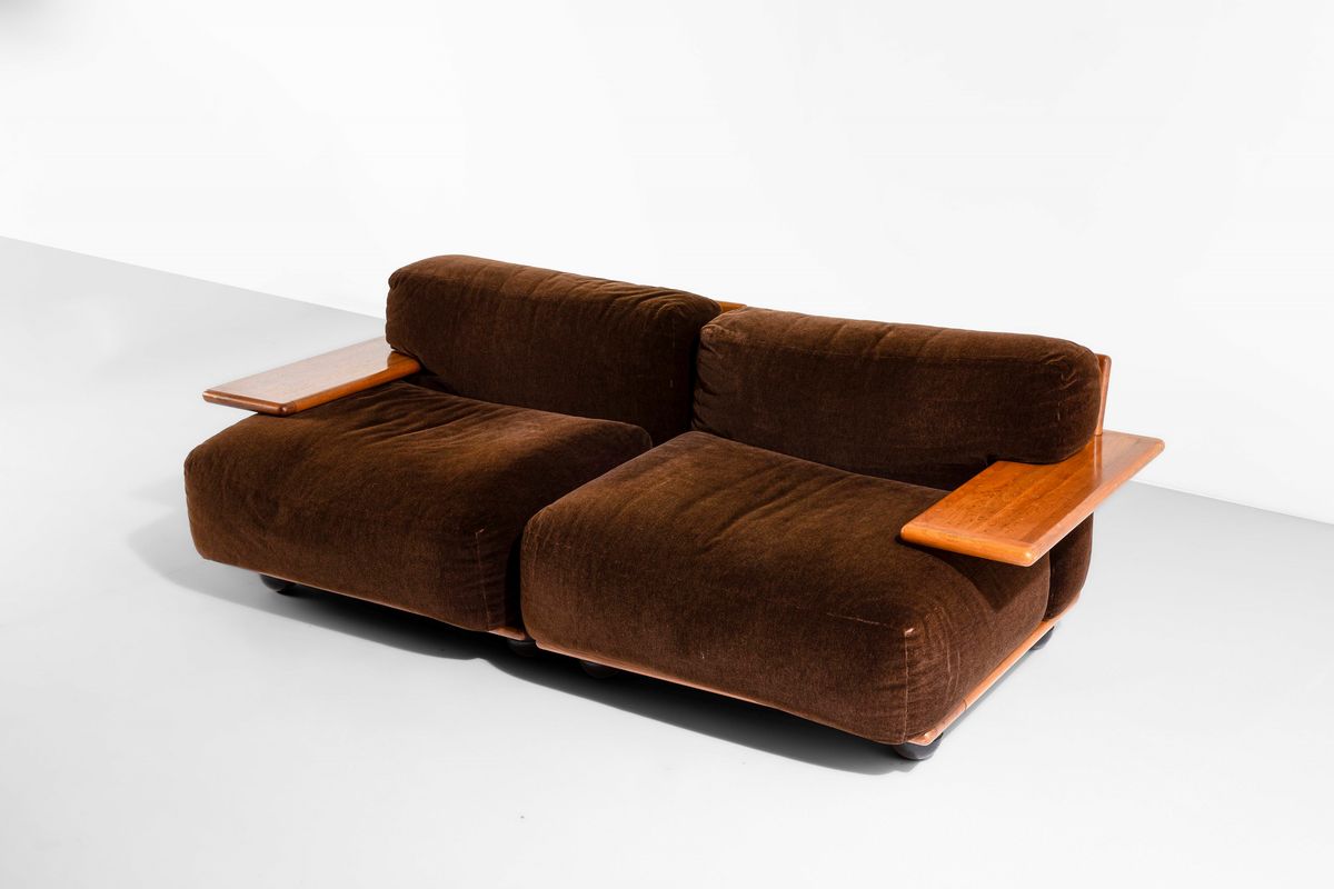Divano a due moduli e tavolo basso mod. Pianura. Struttura in legno e rivestimenti in tessuto. Sostegni in gomma.