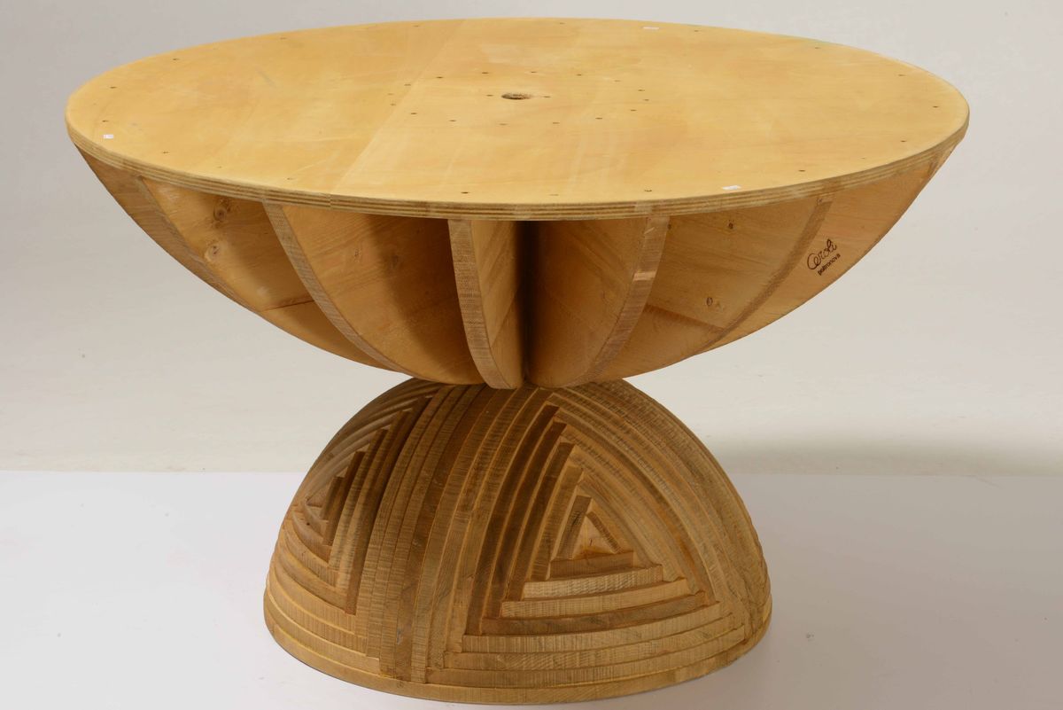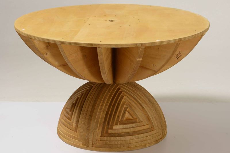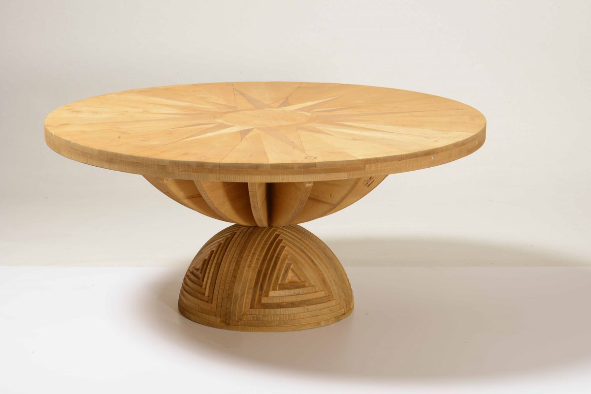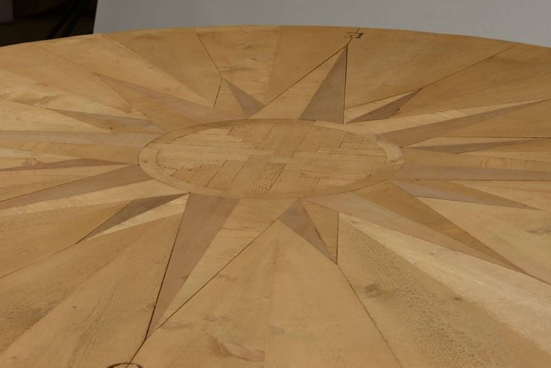 Tavolo mod. la Rosa dei Venti con struttura in legno e piano decorato a intarsio.