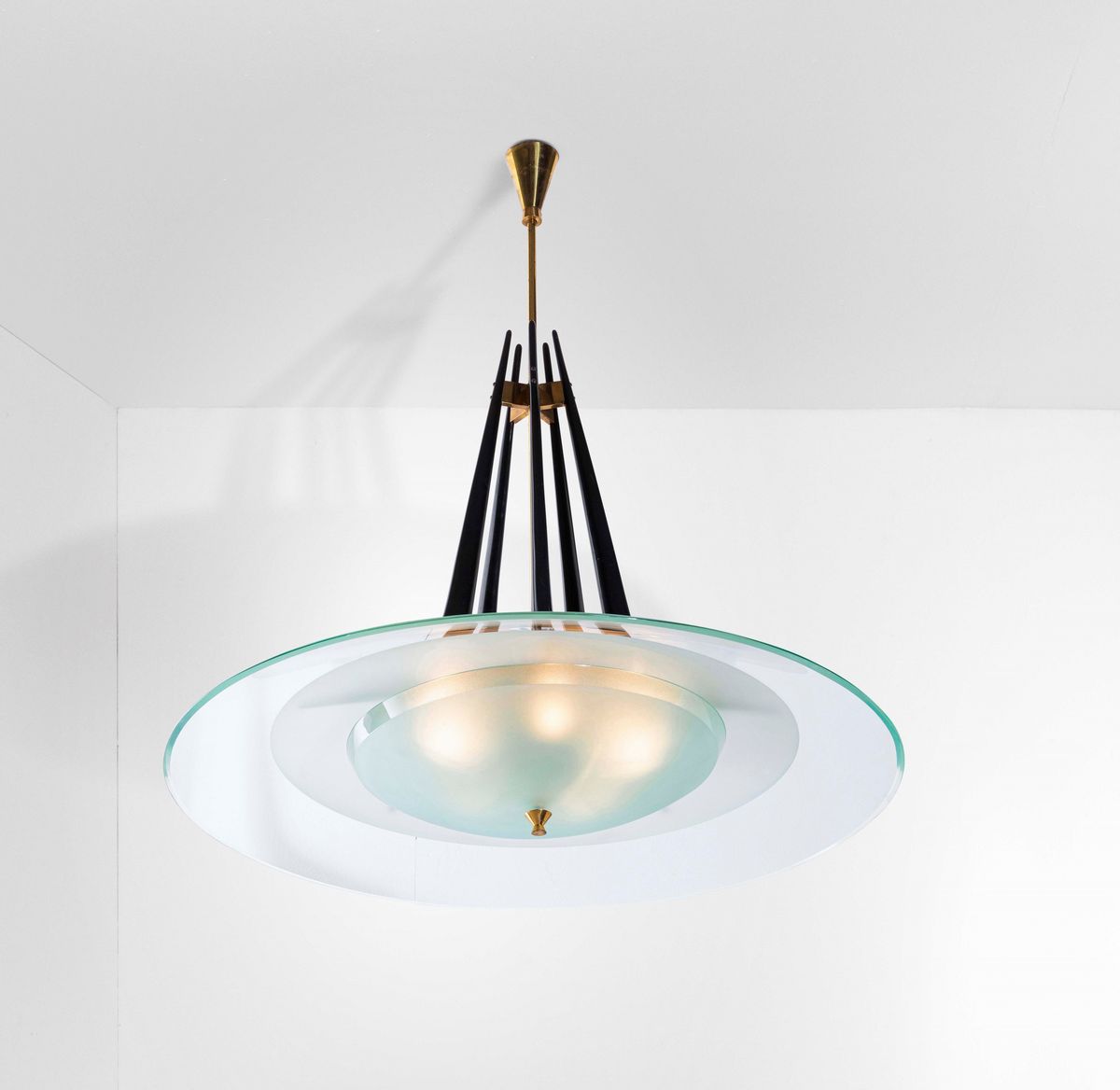 Lampada a sospensione con struttura in ottone e metallo laccato. Diffusori in cristallo curvato molato e cristallo curvato molato satinato.