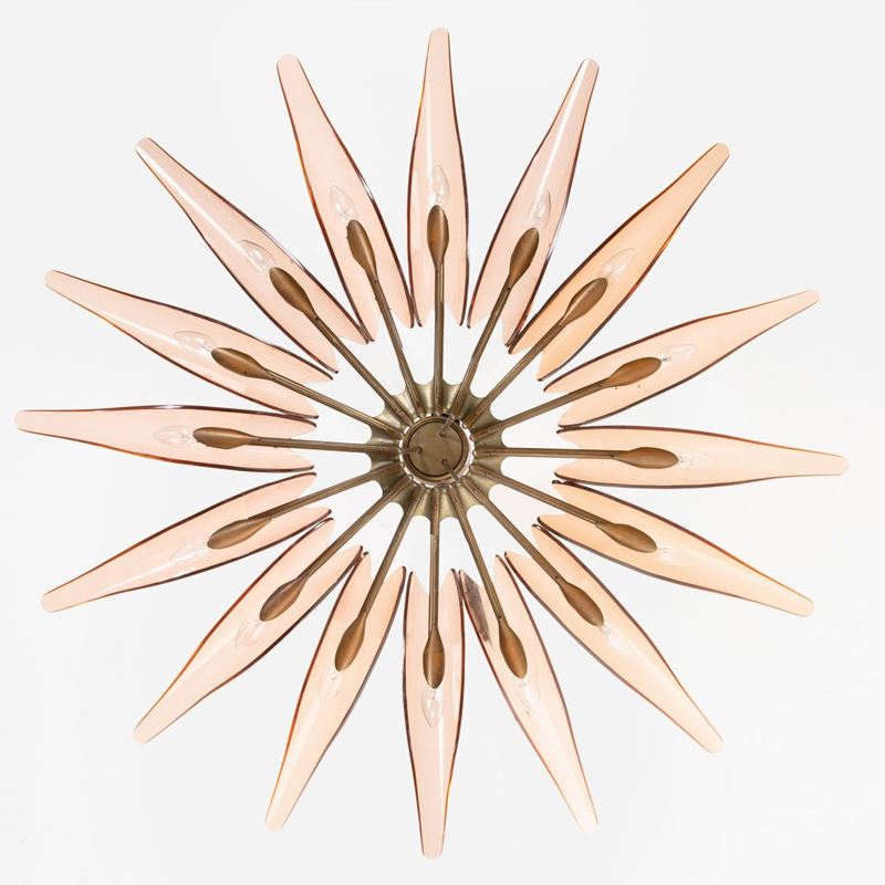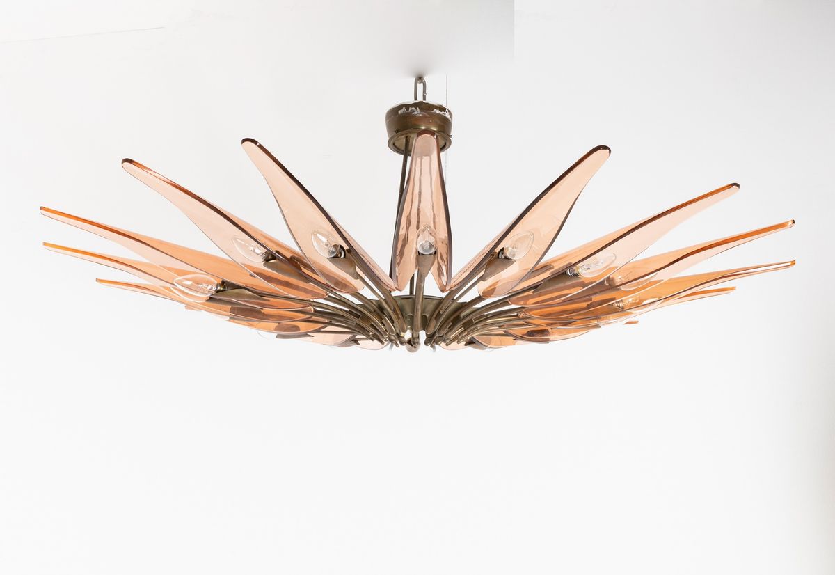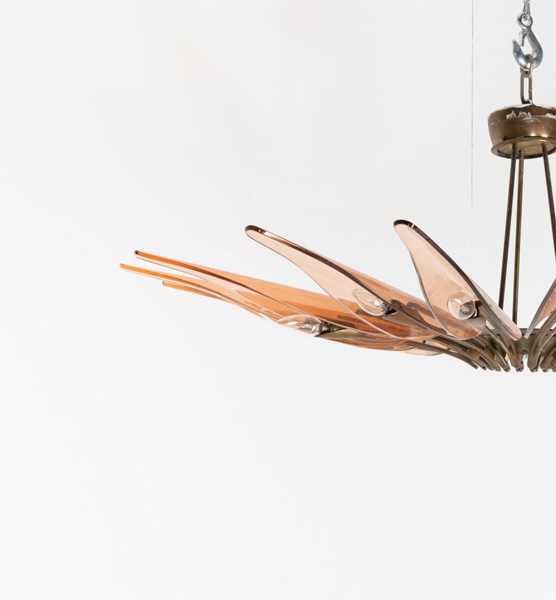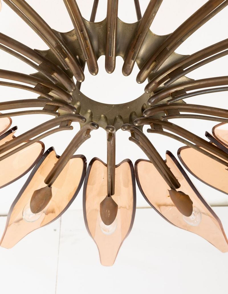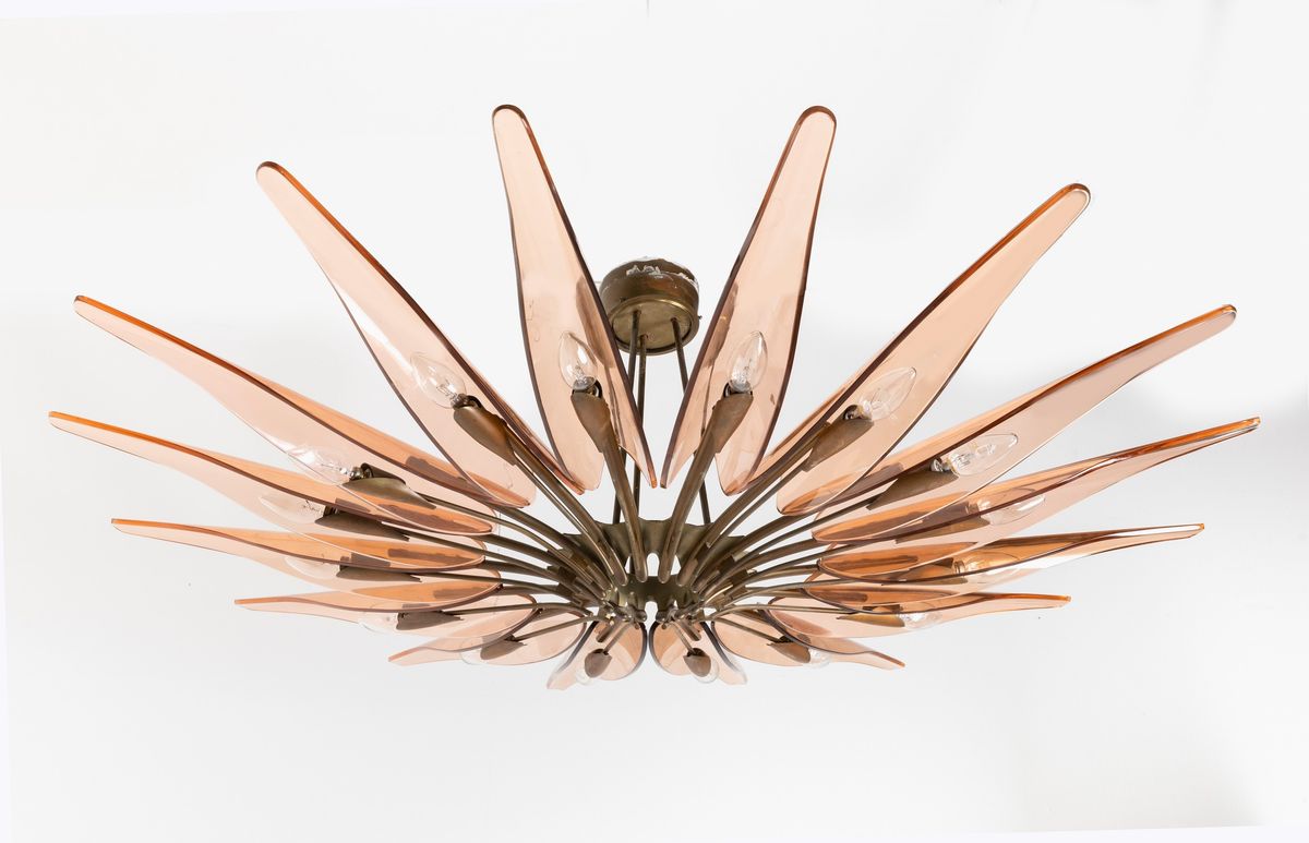 struttura in ottone zapponato e ottone nichelato. Diffusori in cristallo colorato, curvato e molato.