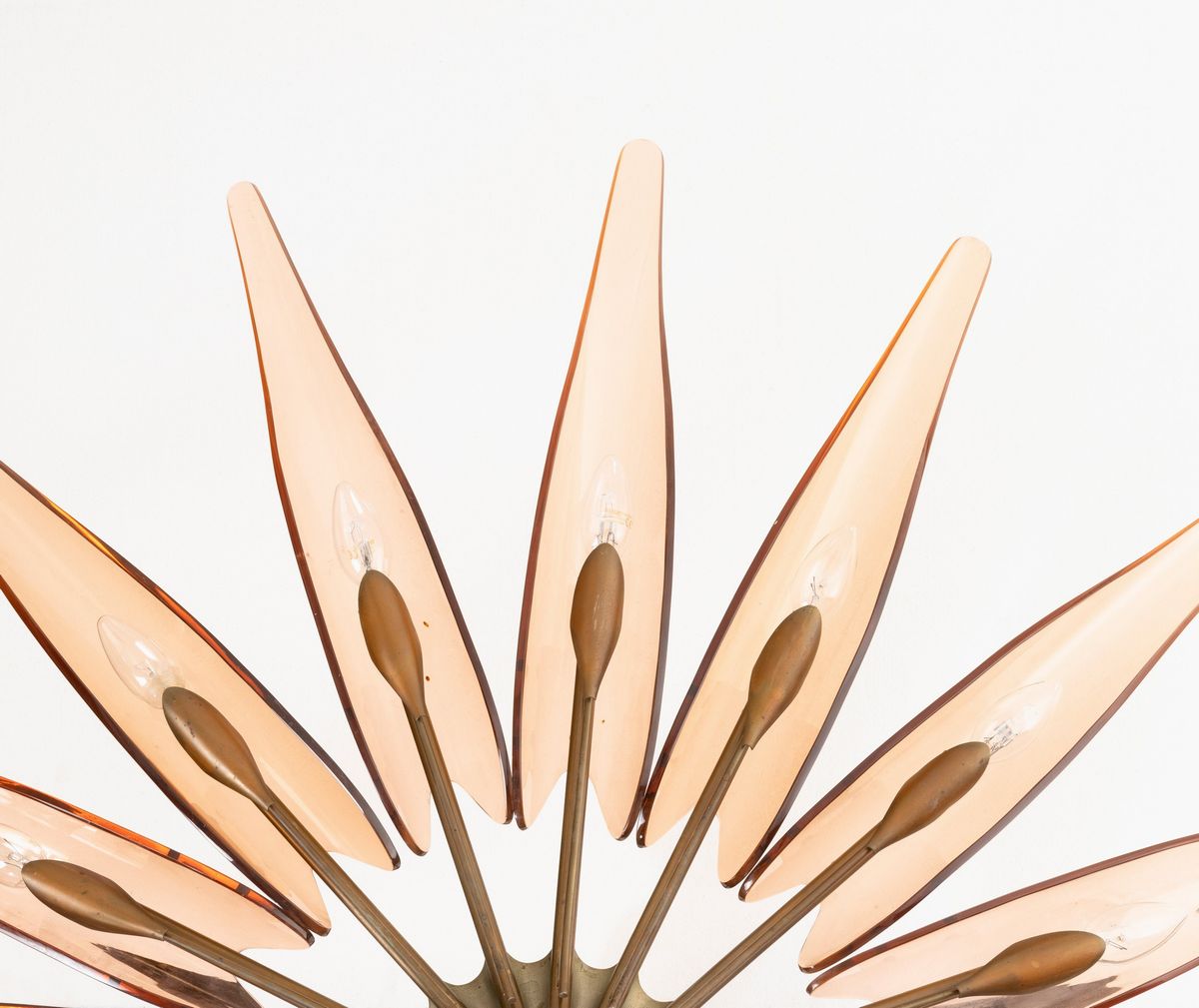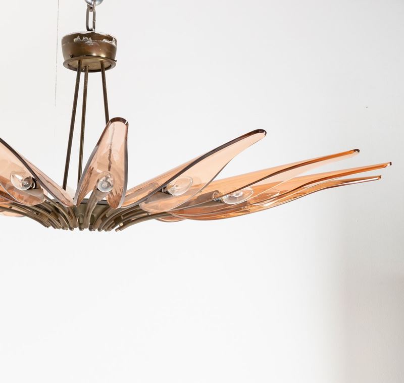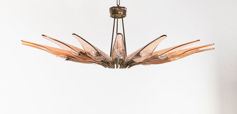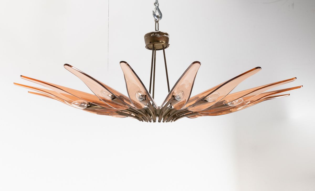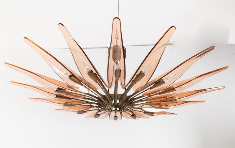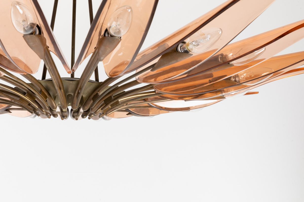 struttura in ottone zapponato e ottone nichelato. Diffusori in cristallo colorato, curvato e molato.