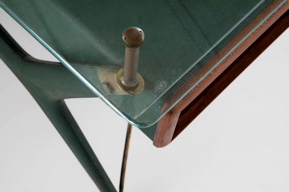 Scrivania con struttura in legno e dettagli in ottone. Piani in vetro Vitrex. Rivestimenti in skai.