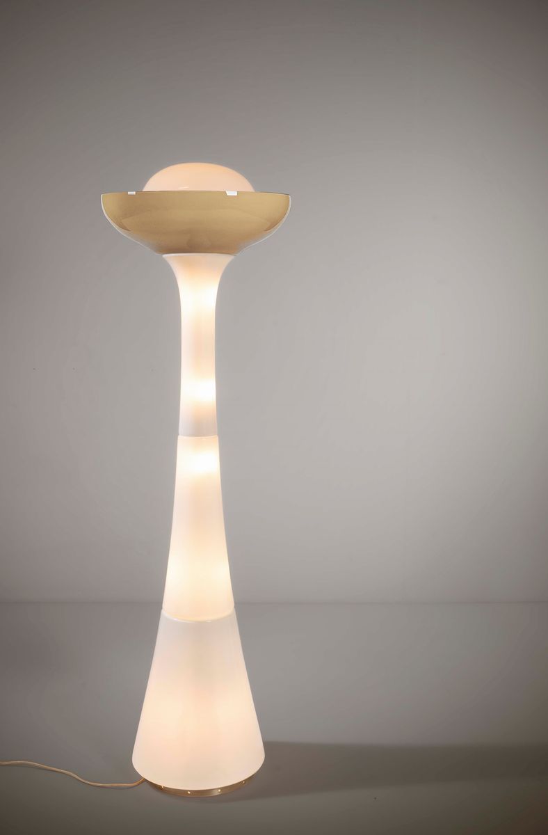 Lampada da terra con struttura in metallo cromato e vetro lattimo di Murano e diffusore in vetro di Murano colorato.