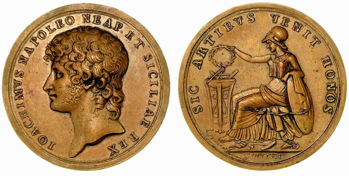 IOACHINVS NAPOLEO NEAP.ET SICILIAE REX Testa del Re a s. R/ SIC ARTIBVS VENIT HONOS Minerva galeata, seduta a s., posa con la d. una corona di alloro su di un tripode e poggia l'avambraccio sinistro su di uno scudo; all'esergo, MDCCCXI. Ricciardi 86. Siciliano 28. Julius 2476/7. Bramsen 1136. d'Essling 2563. D'Auria 93. diam. mm. 43,2. SPL