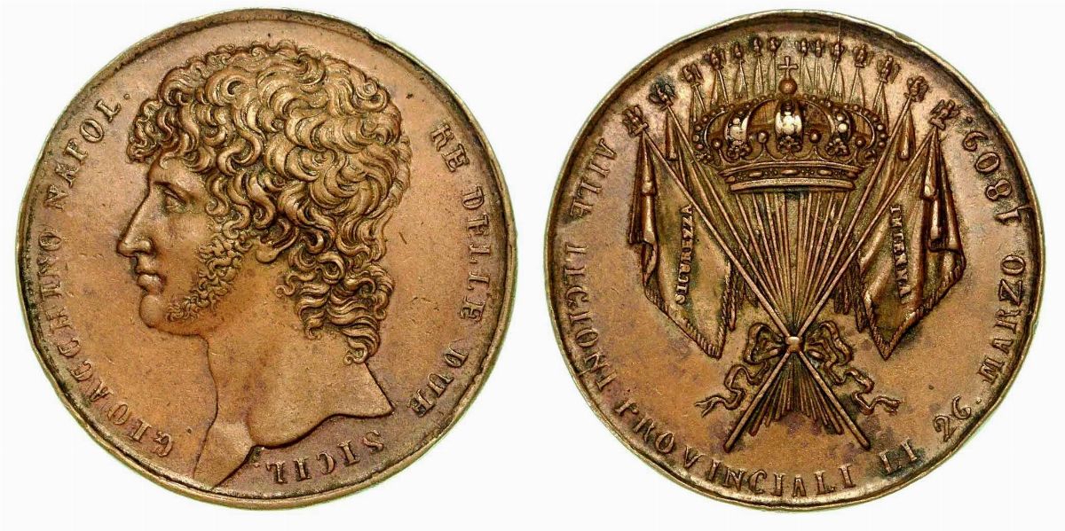 "Gioacchino Murat fu nominato Re delle Due Sicilie il 1 agosto 1808 al posto di Giuseppe Bonaparte passato al trono di Spagna. Murat, anche in considerazione del fatto che in Sicilia regnava Ferdinando IV, protetto dagli Inglesi, fondò nel 1809, 14 legioni da affiancare all’esercito regolare. La consegna delle bandiere avvenne il 26 marzo e, in quella occasione, venne distribuita questa medaglia...” (Da A. Brambilla, op cit. p. 87).