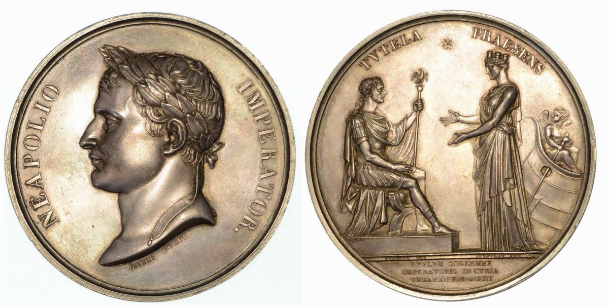 Busto del Bonaparte laureato a s. R/ TVTELA PRAESENS Napoleone, in abiti romani, seduto davanti alla personificazione di Parigi. Opus Galle e Jeuffroy. Br. 358. Julius 1295. diam. mm. 68. SPL/FDC