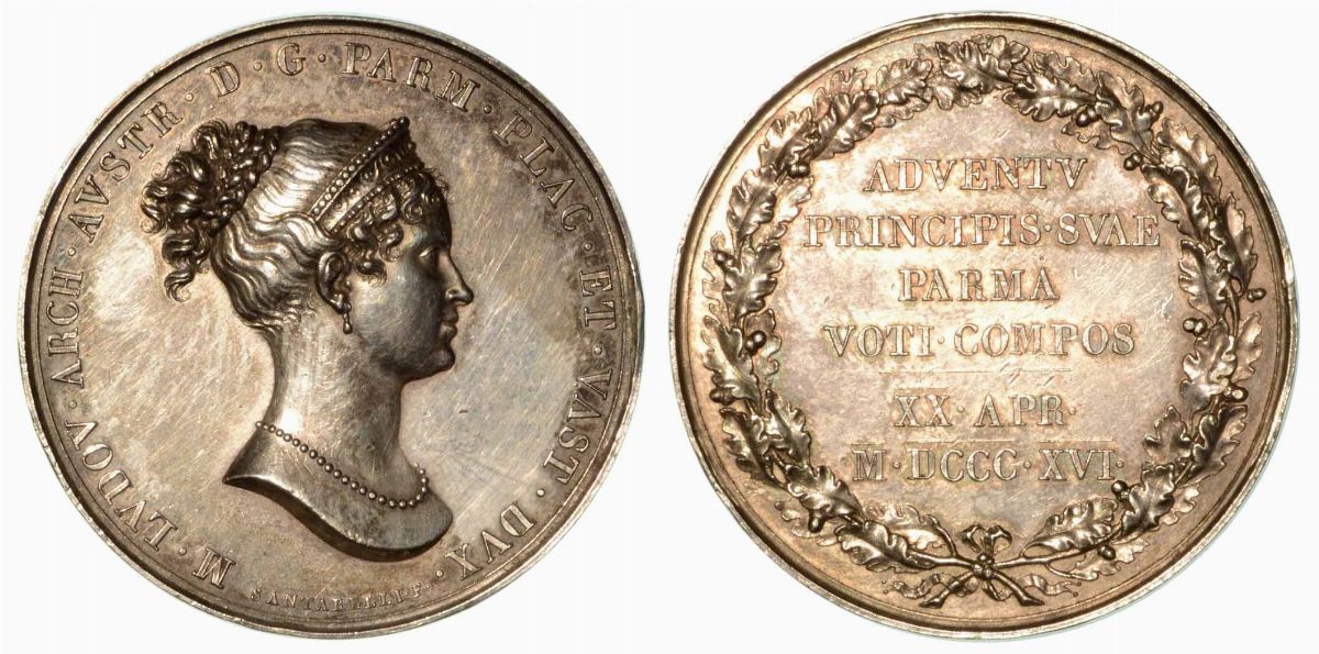 Busto a d. diademato, un filo di perle attorno al collo. R/ Tra rami di alloro e quercia scritta ADVENTV•/ PRINCIPIS• SVAE/ PARMA•/ VOTI• COMPOS•/ XX • APR •/ A•M•DCCC•XVI. Johnson 3. diam. mm. 41. q.SPL