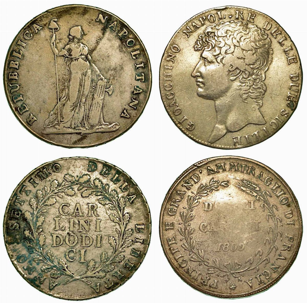 Repubblica Partenopea 1799. Piastra da 12 1799. Arg. g. 27,41. Murat, 1808-1815. Piastra da 12 1809. Arg. g. 27,29. B/MB.