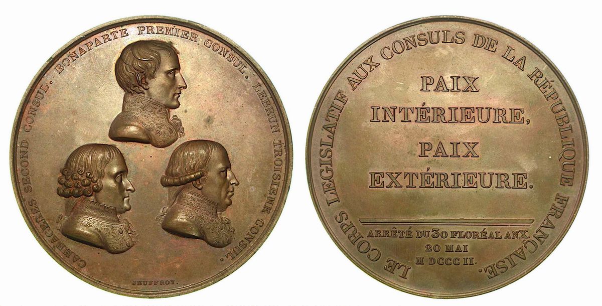Nel centro i tre busti dei consoli Bonaparte, Cambaceres e Lebrun di profilo a d. R/ Al centro leggenda PAIX INTERIEURE PAIX EXTERIEURE e all'esergo, data. Opus Romain - Jeuffroy. Coll. Essling 983. Bramsen 218. Julius 1093. diam. mm. 68. SPL
