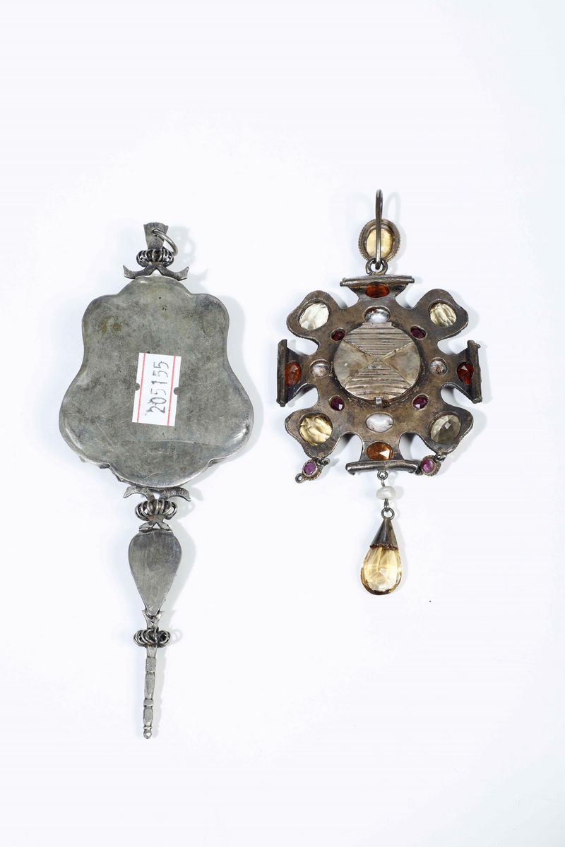 Due pendenti Metallo fuso, argentato, sagomato e smalti Castoni con pietre colorate e perline Oreficeria del XVIII secol [..]