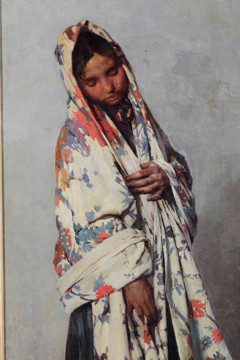 La morbidezza con cui viene resa la stoffa, la precisione della resa pittorica dei motivi del mezzaro, la tavolozza precisa e ricca, danno risalto alla lettura introspettiva della pensierosa ragazzina che con un gesto semplice coinvolge e cattura l’attenzione dello spettatore.
