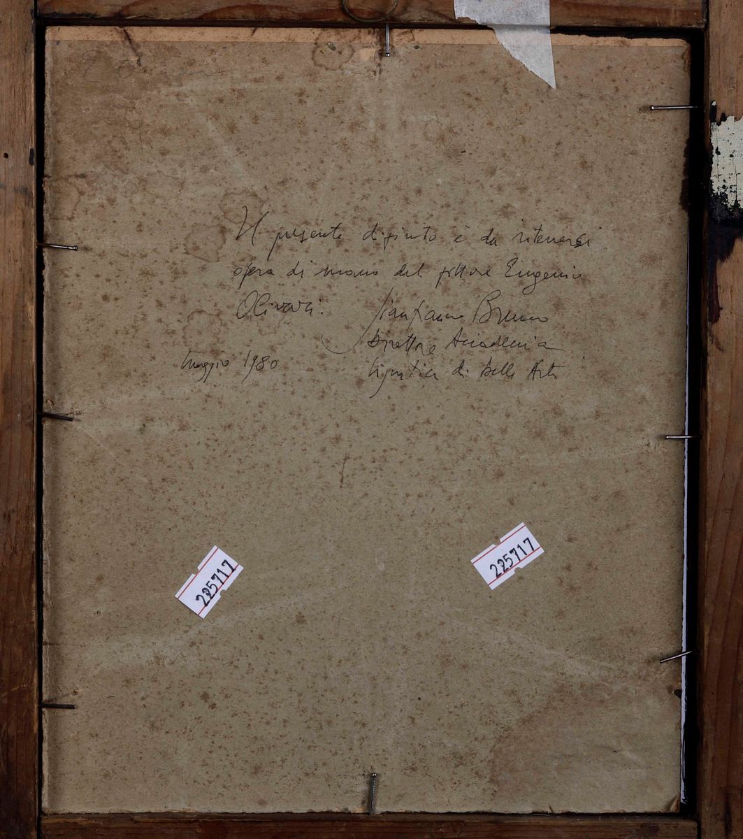 Bibliografia: G. Bruno, La pittura in Liguria dal 1850 al Divisionismo, Avegno (Genova) 1982, p. 67, ill. 70 Questa scena in costume, riferita dalla critica al biennio 1913-1914, riprende temi tipici della poetica di Eugenio Olivari quali gli scorci di terrazze, come quella di Villa Gavotti già trattati un decennio prima. A differenza delle tele precedenti la stesura pittorica di questa composizione tradisce la ricerca di una ‘nuova maniera’ caratterizzata da tinte chiare e delicate in cui si accentua l’immediatezza della pennellata. E’ una dinamica che supera il predominio di tonalità grigio-argentate in favore di una tonalità più rarefatta e luminosa e che diventerà caratteristica per tutte le sue opere successive.