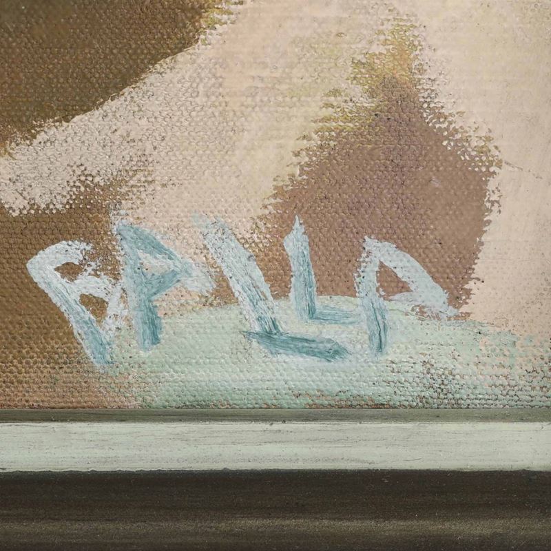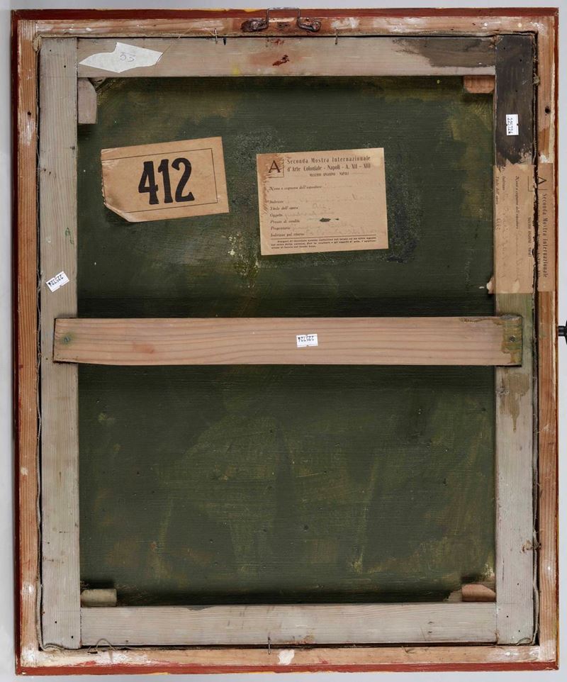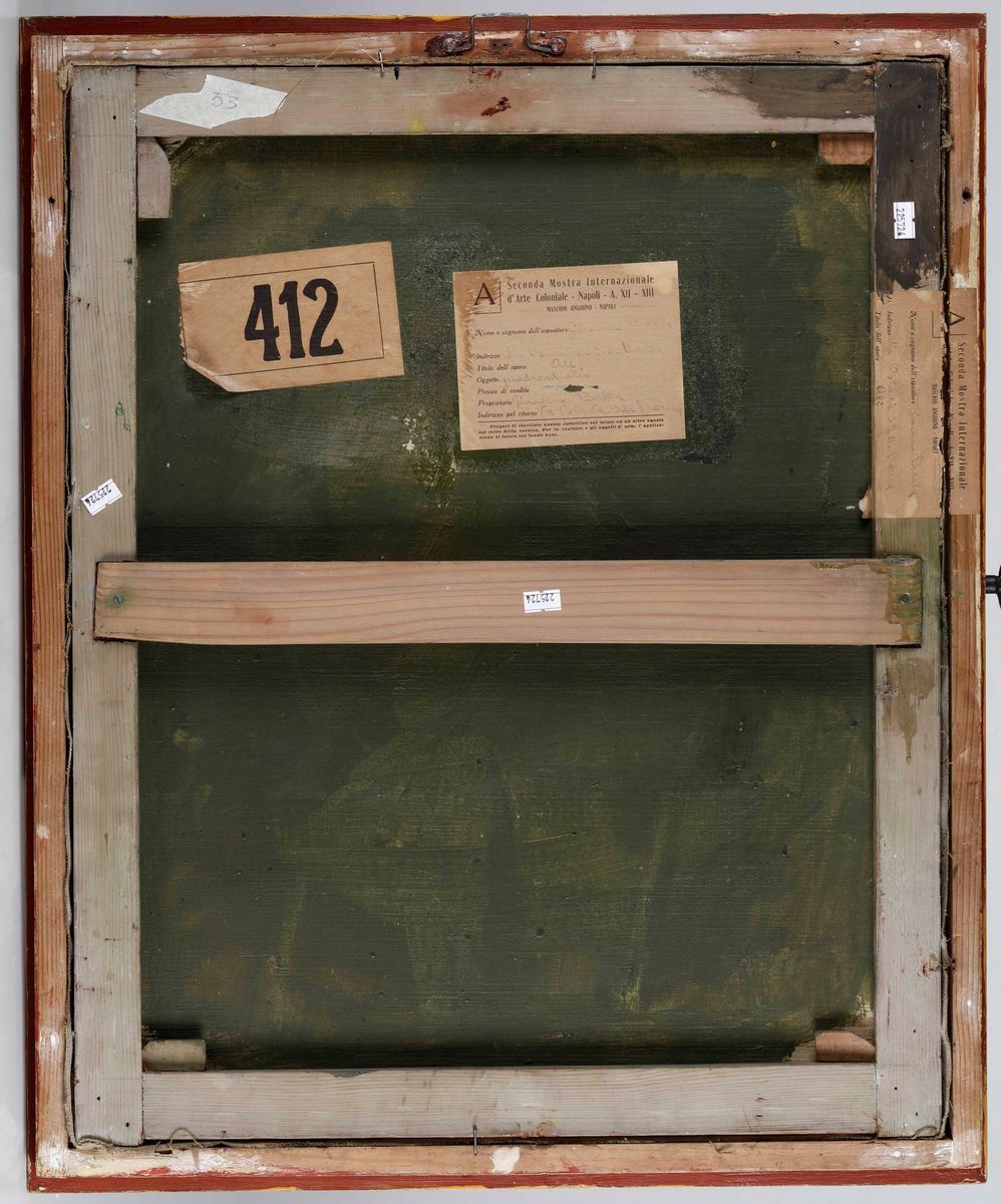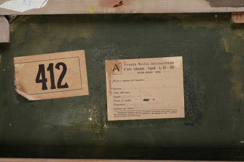 Bibliografia: E. Campama, L’Italia alla II Mostra Internazionale d’Arte Coloniale nel Maschio Angioino di Napoli, ‘Emporium’, vol. LXXX, n. 478, p. 244, ill. p. 243 Al retro due etichette, sulla tela e sulla cornice della Seconda Mostra Internazionale d’Arte Coloniale. Napoli. A. XII-XIII. Maschio Angioino. Autentica del prof. Fabio Benzi su fotografia; si ringrazia la dott.ssa Elena Gigli per aver confermato oralmente l’autenticità dell’opera; autentica di Elica Balla su fotografia