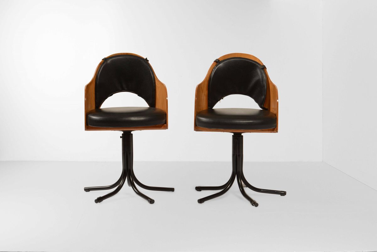 Cinque poltrone con struttura in legno e rivestimenti in pelle.