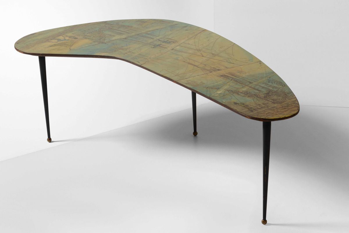 Tavolo basso con piano in legno dipinto e sostegni in metallo laccato e ottone.