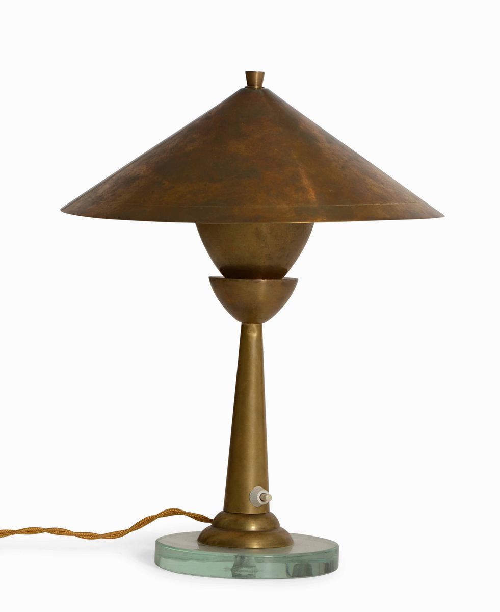 Lampada tavolo con struttura e diffusore in ottone e base in cristallo molato.