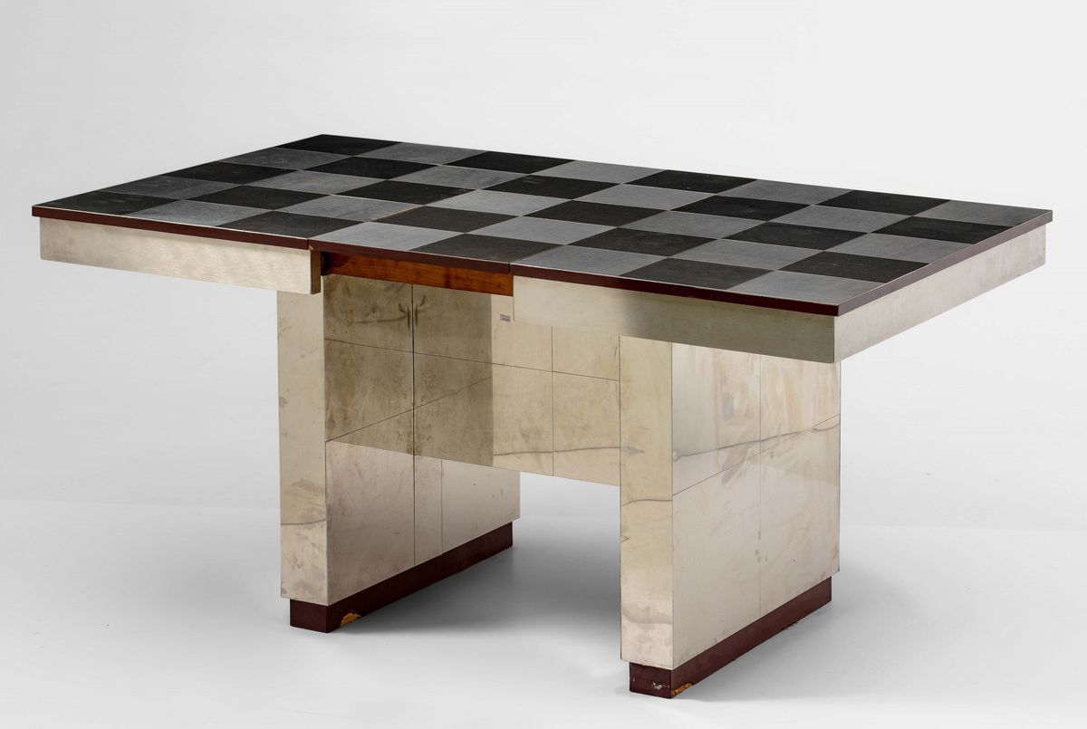 Tavolo con struttura e sostegni in legno rivestiti in acciaio, piano in legno allungabile rivestito da lastre in alluminio satinato e lucido.
