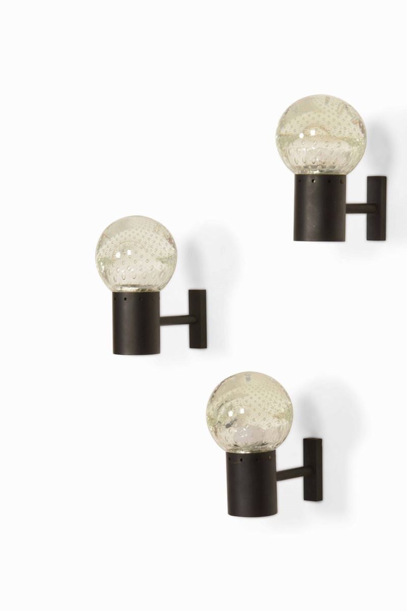 Set composto da una lampada a sospensione e tre appliques. Strutture in metallo laccato, diffusori in vetro di Murano a bollicine.