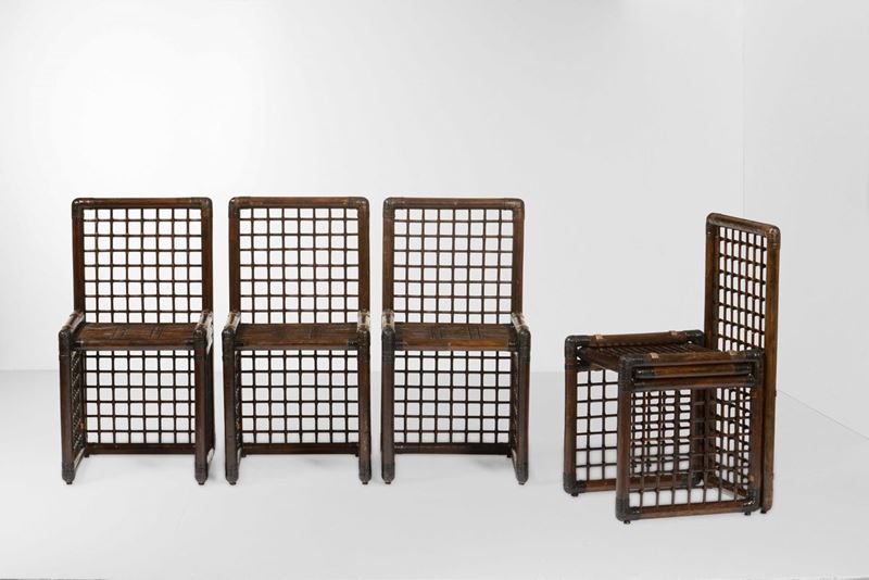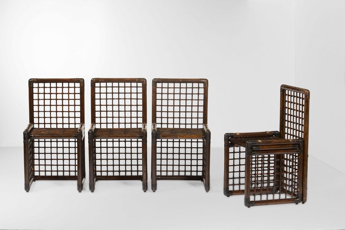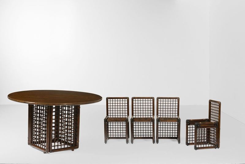 Set composto da un tavolo e quattro sedie con strutture in legno, bamboo e midollino.