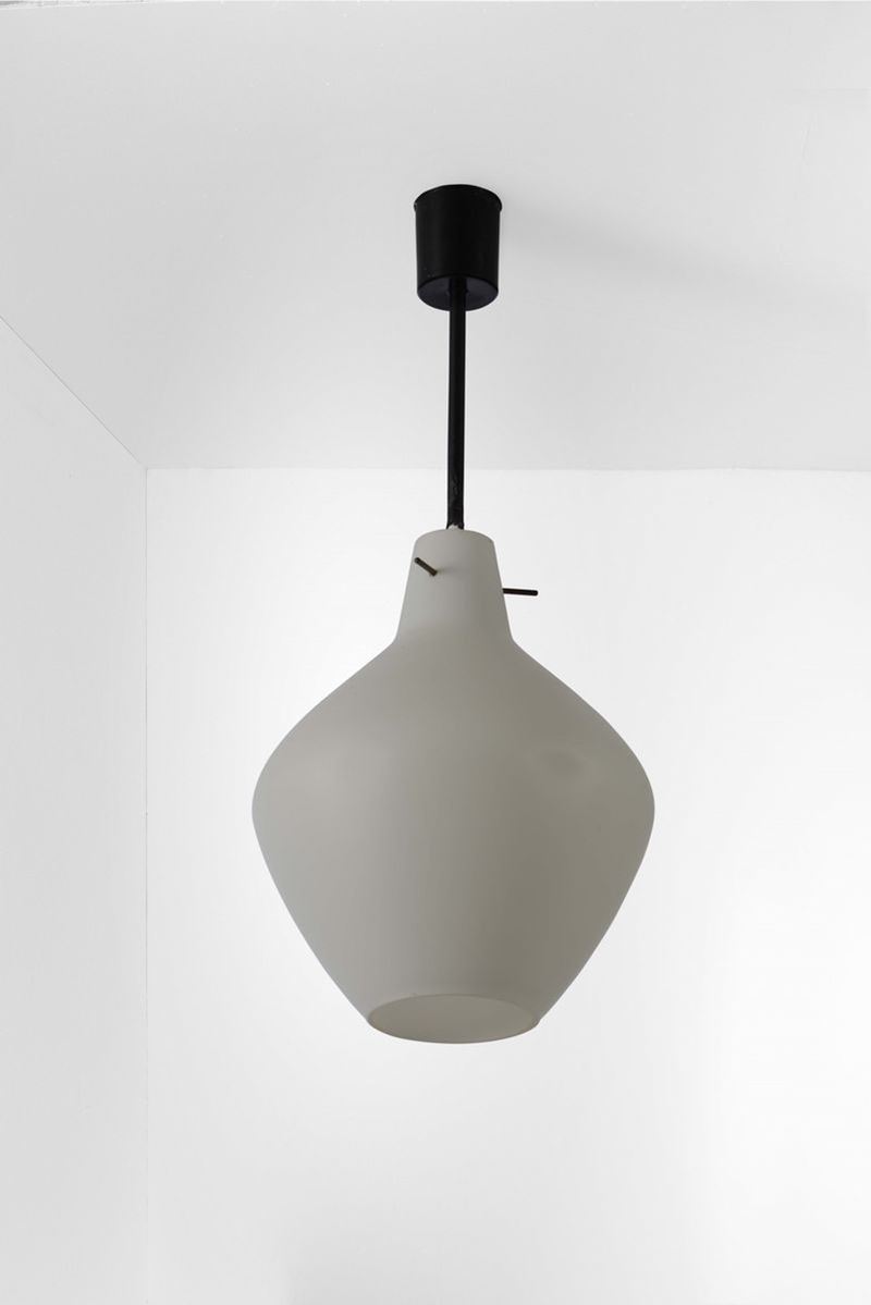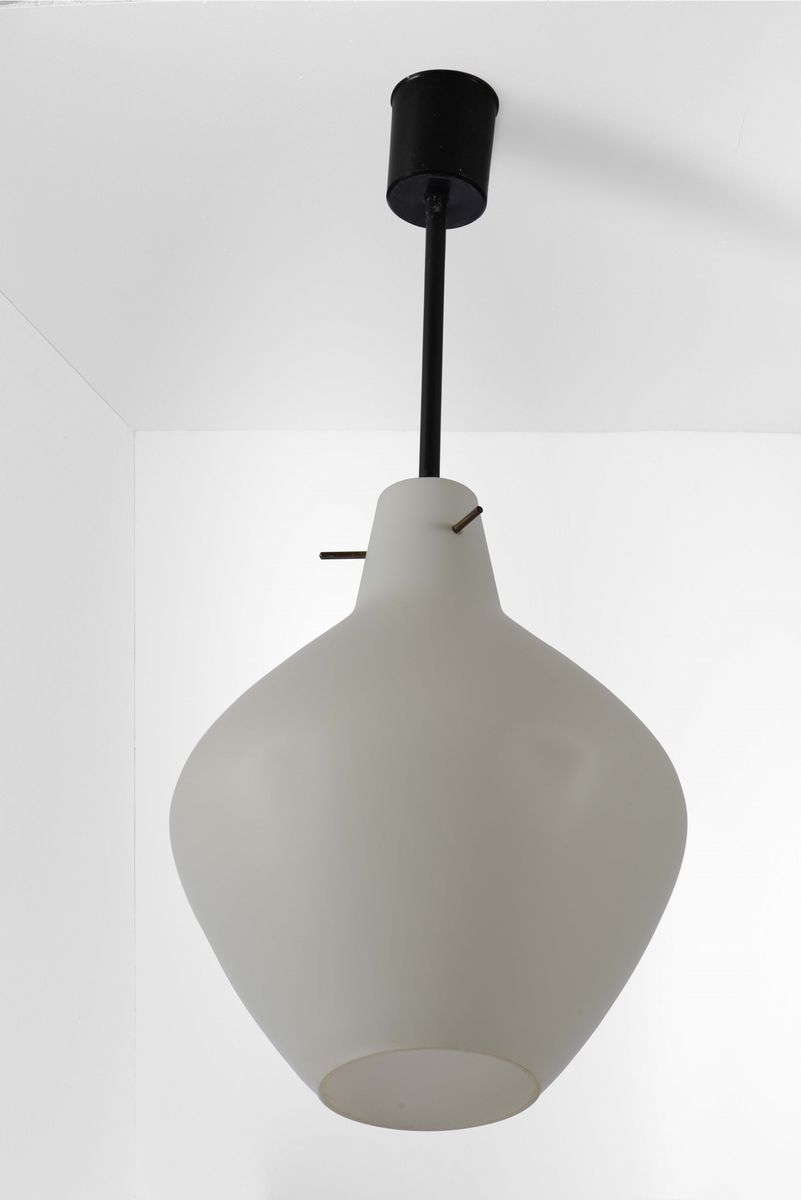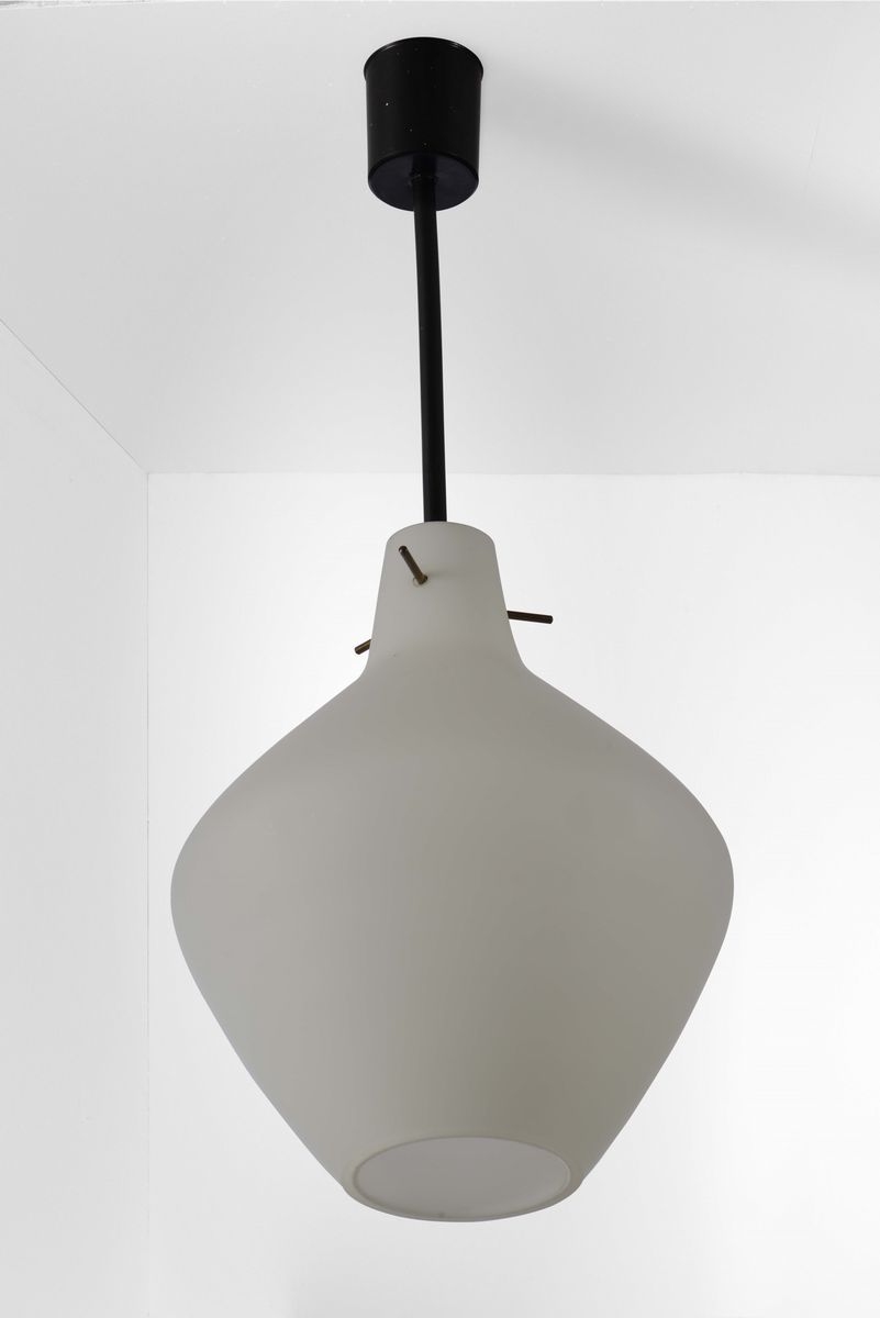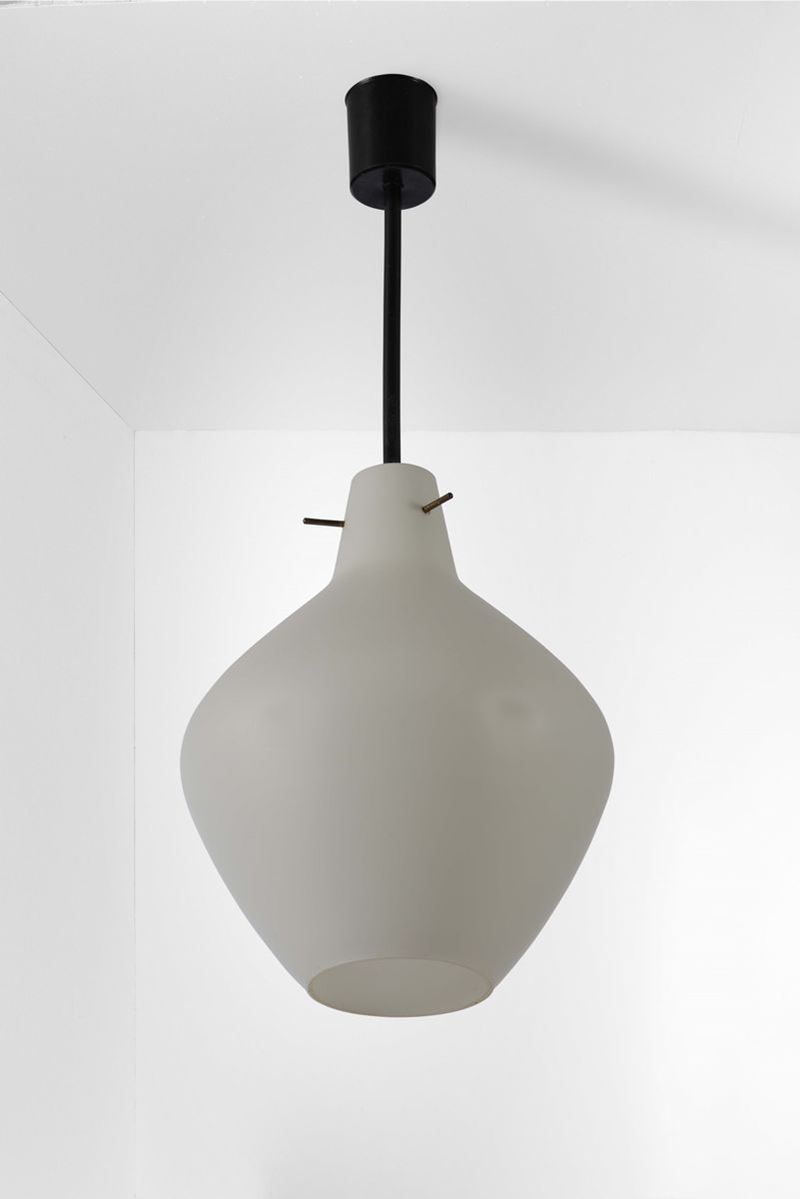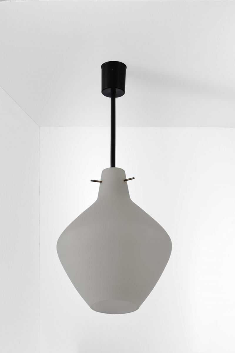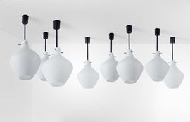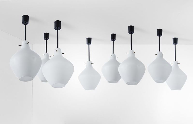 Set di otto lampade a sospensione con struttura in ottone e metallo laccato. Diffusori in vetro opalino.