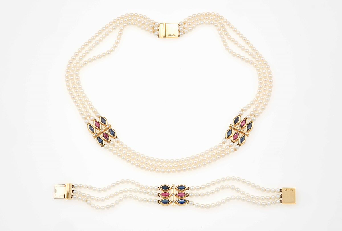 Demi-parure composta da girocollo e bracciale con piccole perle coltivate, zaffiri e rubini, naturali e sintetici