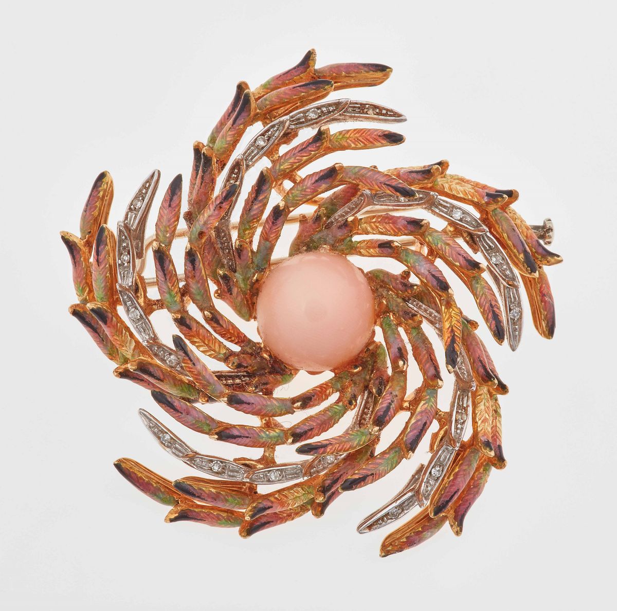 Spilla con corallo rosa, smalti policromi e diamanti taglio huit-huit