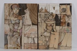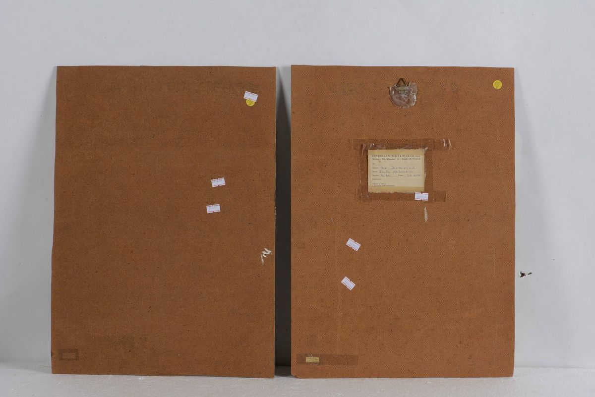due composizioni Vanto domestico e “Ragazza con gatto”, originali creazioni realizzate con stoffe ritagliate e dipinte su supporto di faesite. Al retro etichetta della Galleria Annunciata di Milano.