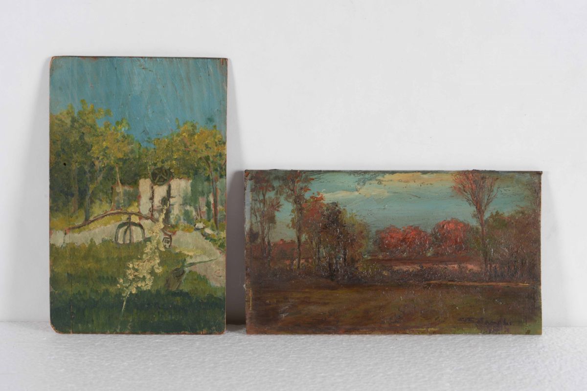dipinti ad olio di autori diversi, 2 su cartone, 3 su tavoletta, uno siglato AE, due firmati per esteso (firme non decifrate). Misure del più grande cm 21 x 28