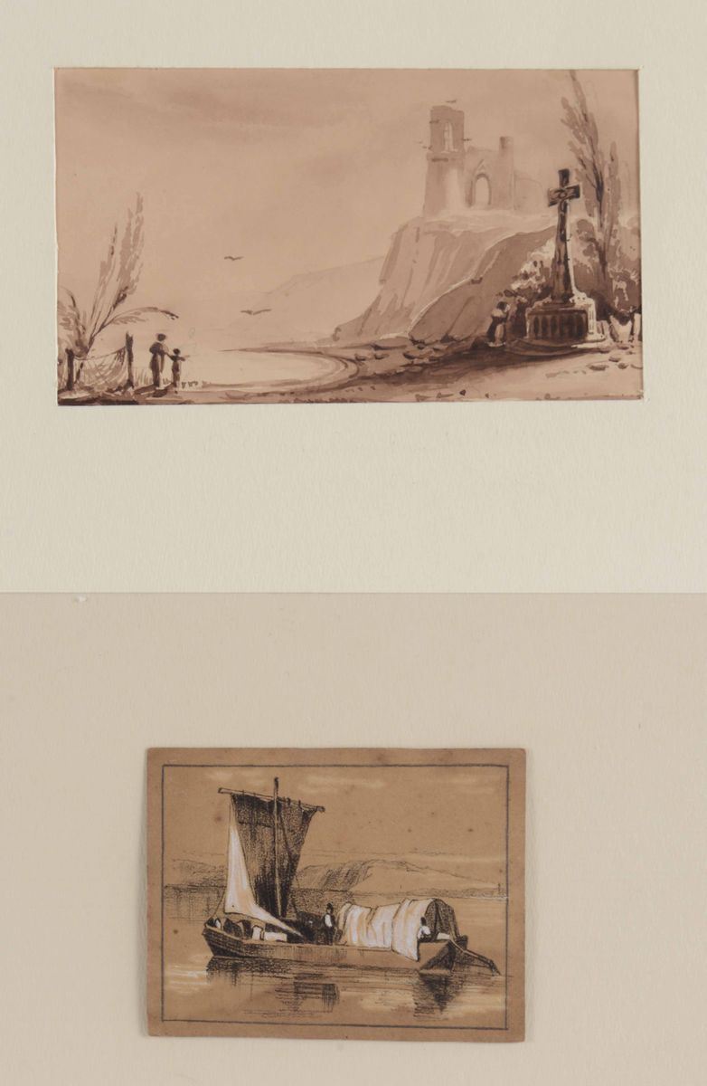 epoche e mani diverse, matita e matita e biacca su carta colorata. Misure: cm 19,8 x 32,5 e cm 20 x 44,5, nel lotto anche una coppia di piccoli paesaggi dell'800: uno condotto a inchiostro, l'altro a carboncino e biacca.