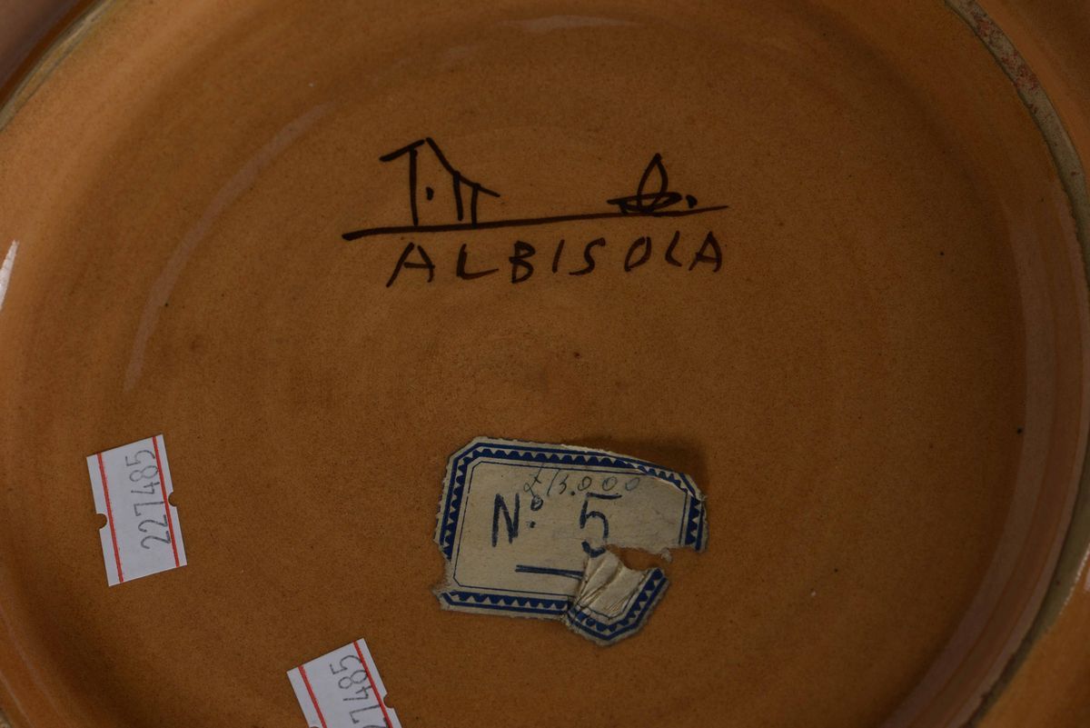 Grande piatto in ceramica dipinta e graffita raffigurante Aulete, firma incisa Biassoni sul bordo e scritta Albisola sul retro. Anni 50/60. Diametro cm 44