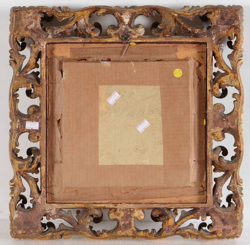 in cornice intagliata e dorata, antico olio su cartone (?). Misure: dipinto, cm 20x21; cornice cm 38x38