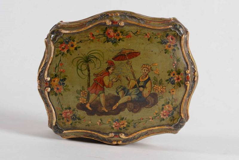 Scatola in legno intagliato e dipinto a cineserie. Venezia XIX secolo