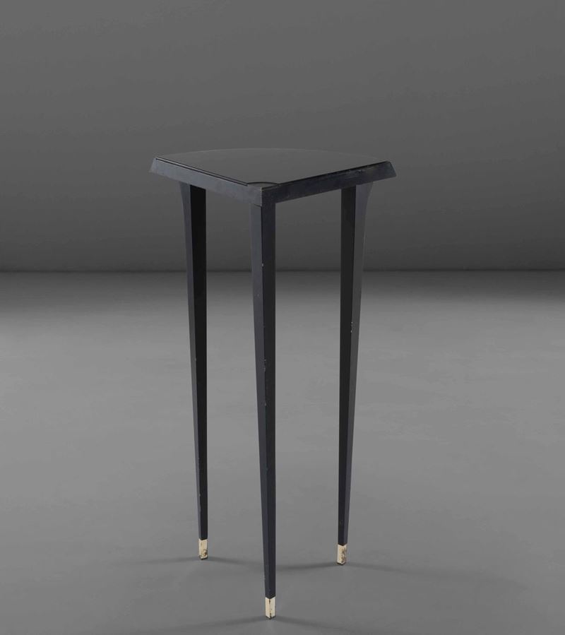 Angoliera mod. Agrilo con struttura in legno laminato decorato e legno laccato. Piano in vetro opalino nero con puntali in metallo. Etichetta originale. Etichetta sotto il piano: AM Zabro 016175 Divisione Nuova Alchimia 1984.