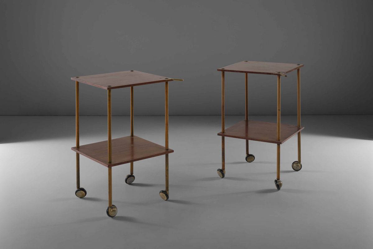 Due tavolini di servizio con struttura in ottone e piani in legno.
