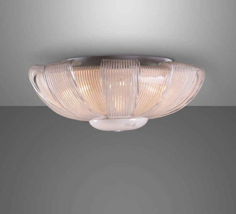 Lampada a plafone con struttura in metallo e vetro di Murano.