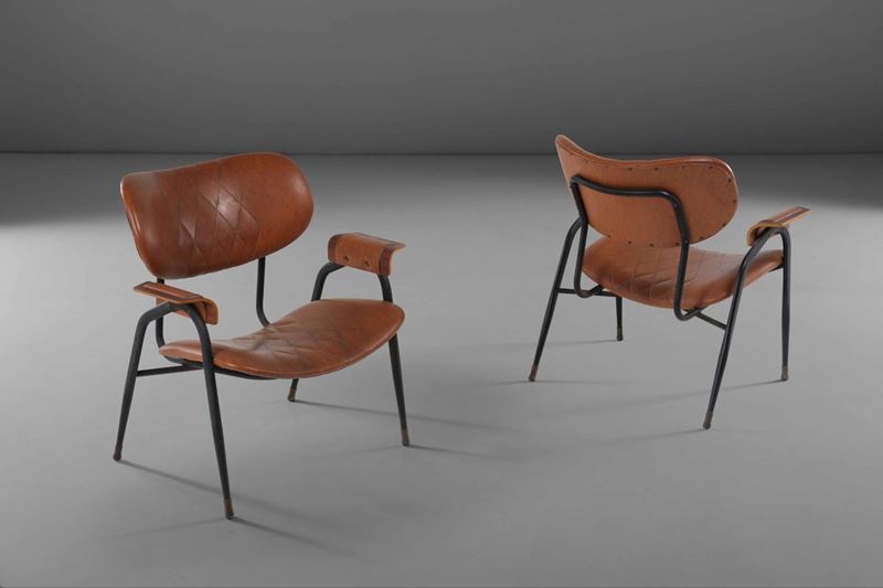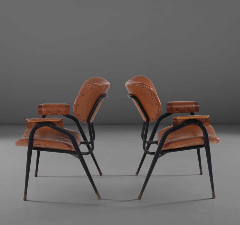 Coppia di poltroncine con struttura in metallo laccato e legno, rivestimenti in pelle.