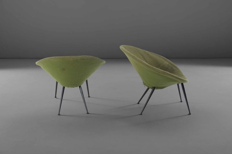 Coppia di poltrone con sostegni in metallo laccato e rivestimenti in tessuto.