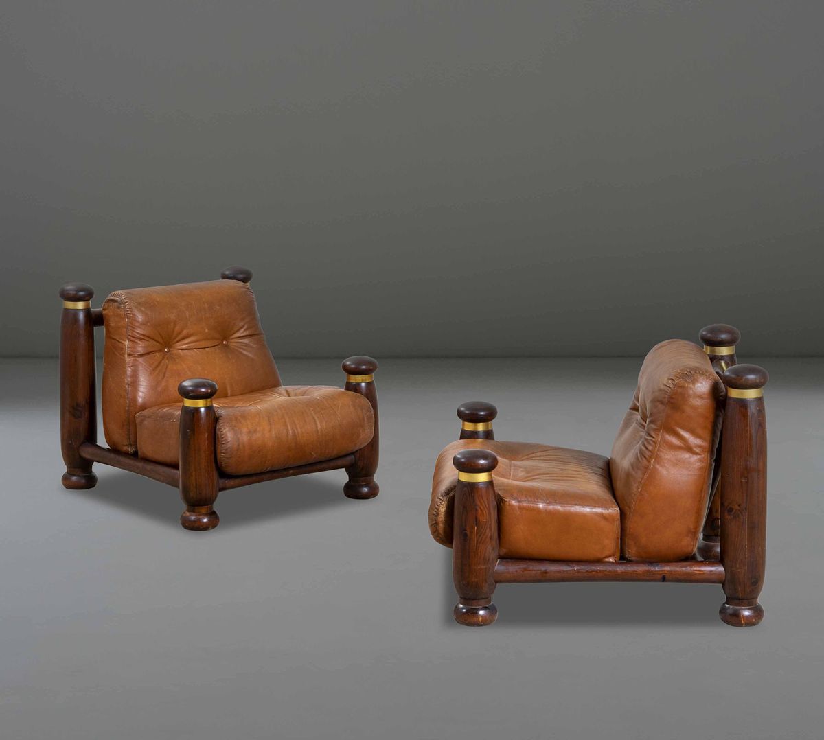 Coppia di poltrone con struttura e sostegni in legno, rivestimento in pelle e particolari in ottone.